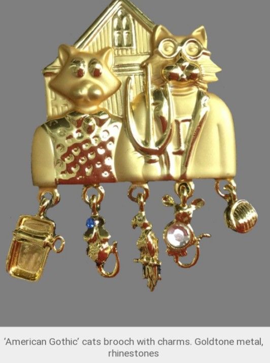 "American Gothic" is the title of this piece created by AJC out of humor for the recipient. AJC stamped on back. Gold tone with rhinestones.