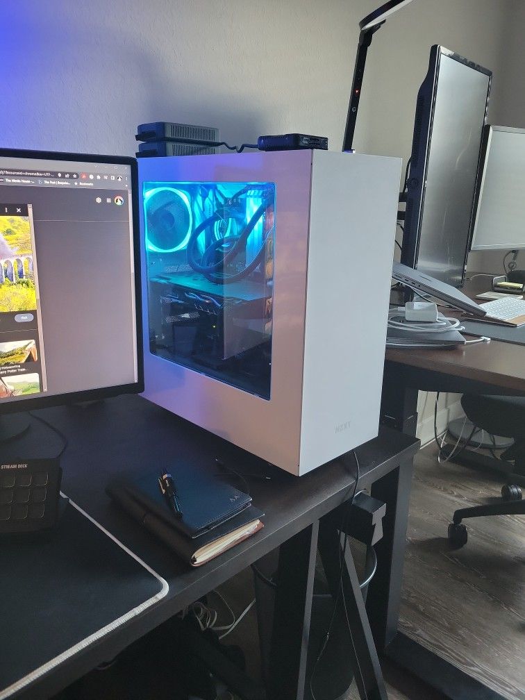 NZXT Case ASUS ROG Strix Z370-E Vengeance RGB PRO 64GB RAM Intel i7-8700 2 m.2 cards (250 gb, 500gb) NZXT Kraken RGB 280mm Elgato capture card Expansion USB ports Razer huntsman white Razer basilisk white Surface dial