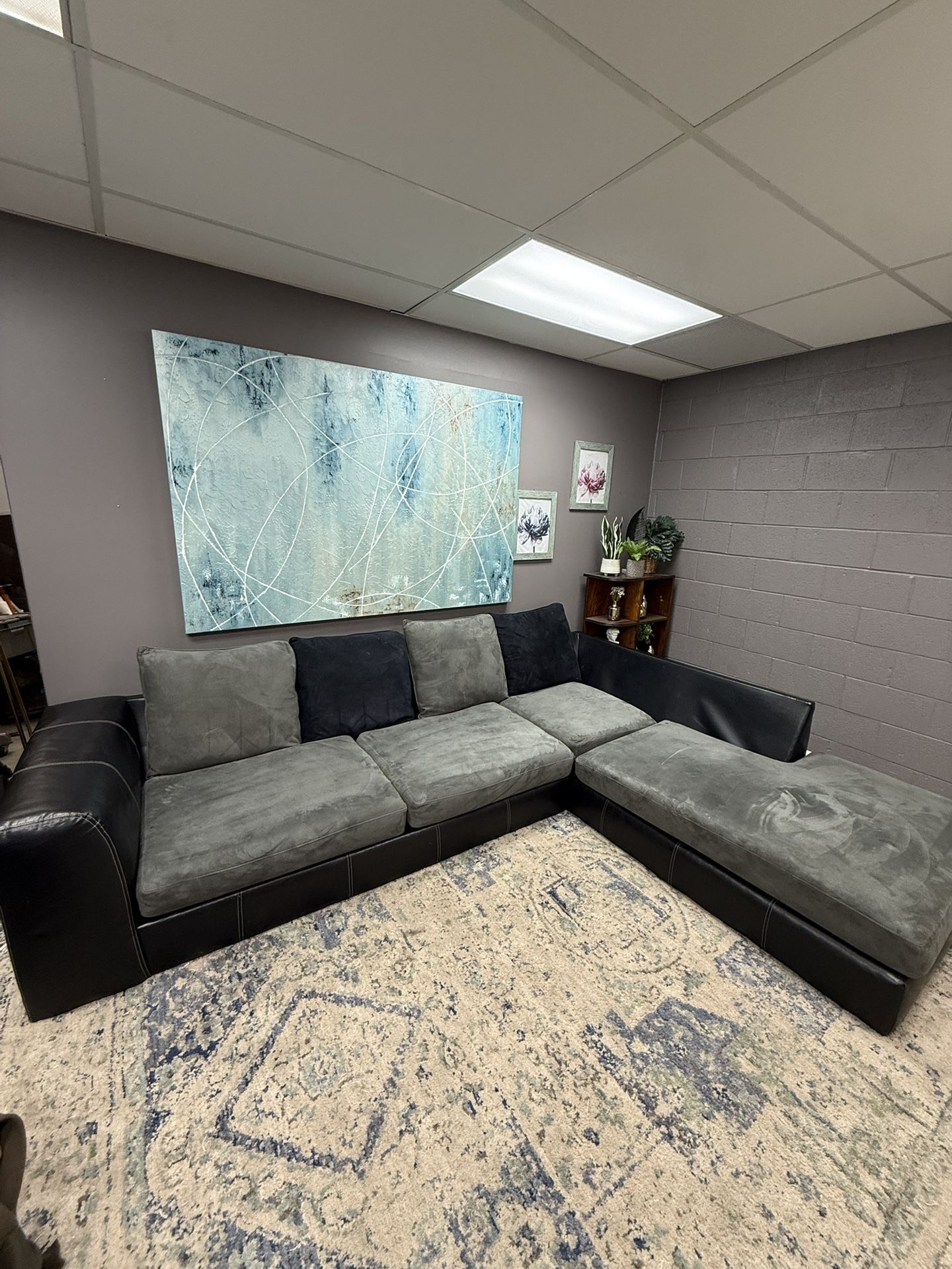 Sectional Sofa. It has a leather base with fabric cushions. It is in good condition and has lots of year left. Super comfortable! Message me if interested. Ask about delivery if needed. Check out my other listing for all of your furniture/ household needs