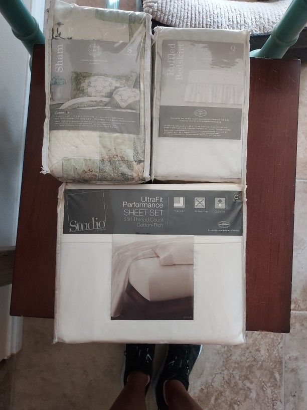 Queen size set with 2 pillow cases, fitted sheet and flat sheet 2 shams, bedskirt All brand new