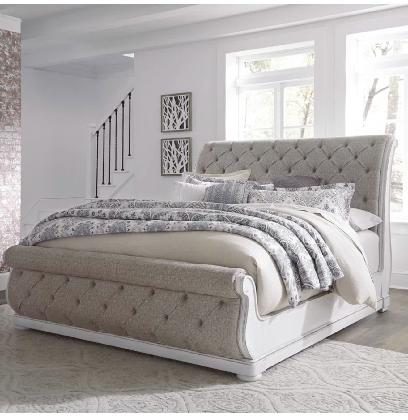 Tufted upholstered sleigh bed with wood frame