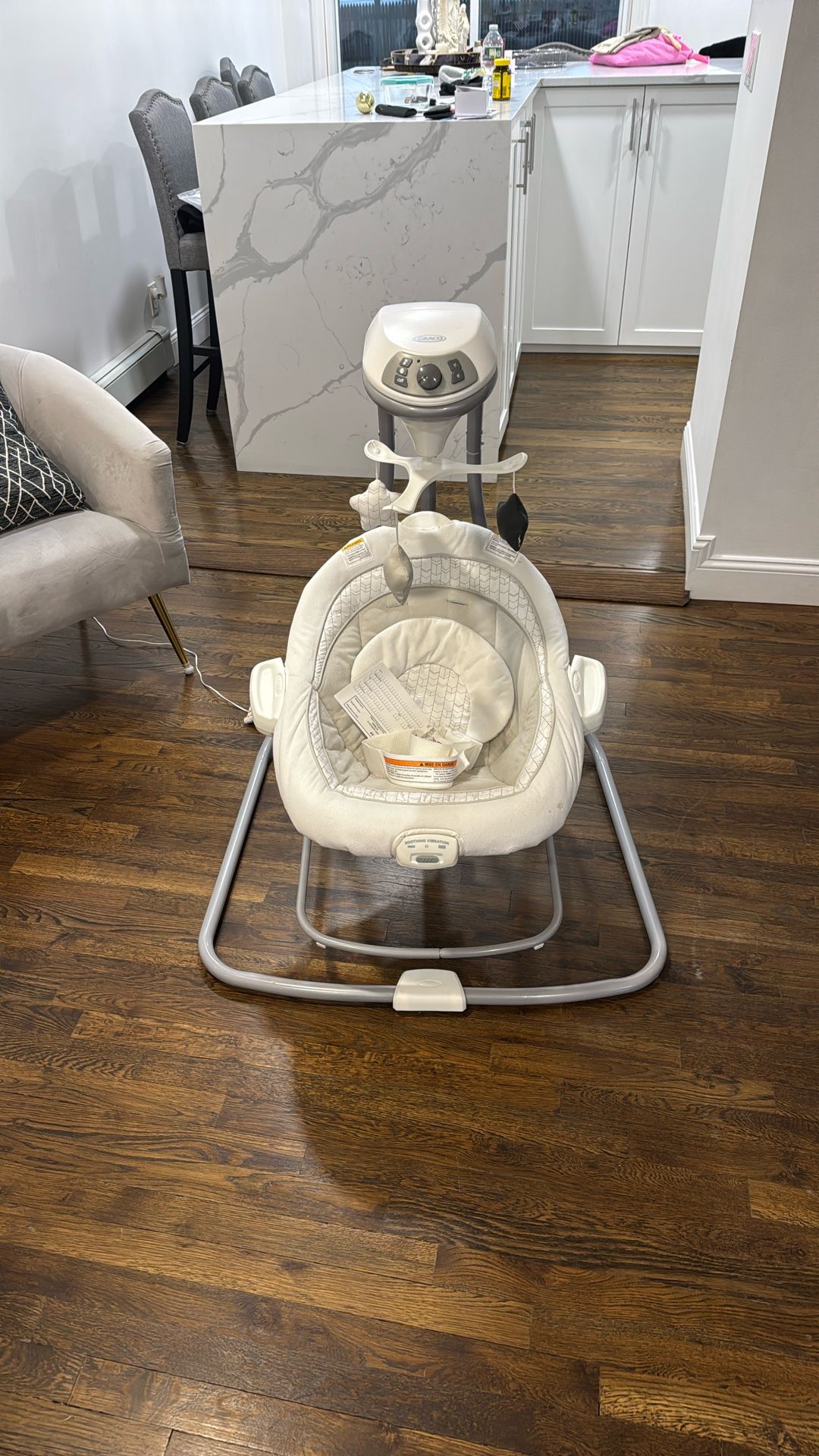 The Graco Simple Sway Swing is fully featured to help you soothe and comfort baby. Gentle side-to-side swaying and 6 different speeds allow you to customize to baby's preference. This baby swing also features 15 songs and sounds, a cozy head support, and soothing two-speed vibration to keep your little one content. The option to plug in or use batteries makes this Graco swing ideal for any room in the home.