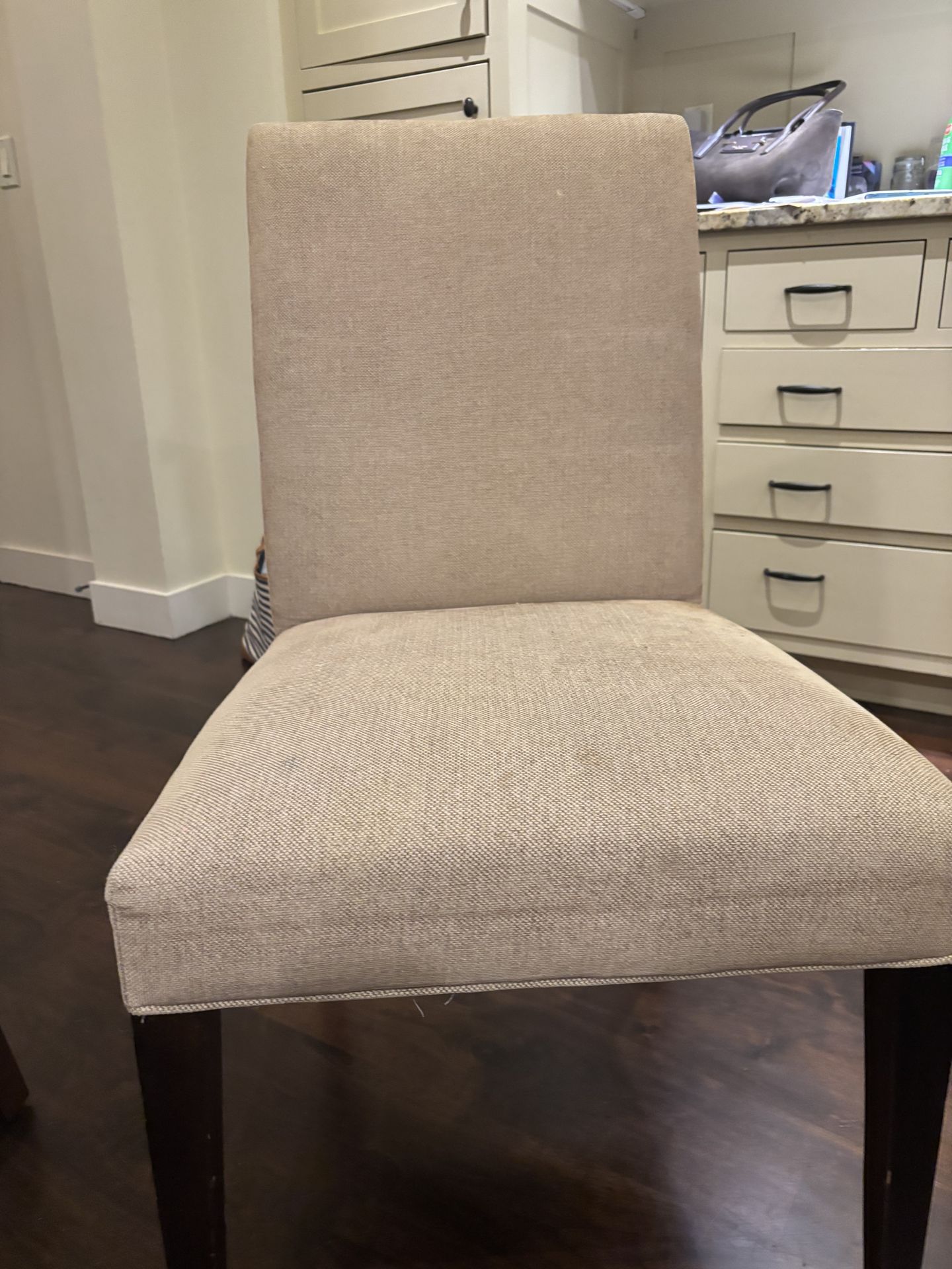 4 solid parson style chairs from Crate & Barrell. Neutral tan fabric cushions are dirty, need cleaning. You haul from West Bellevue area, first come, first serve.