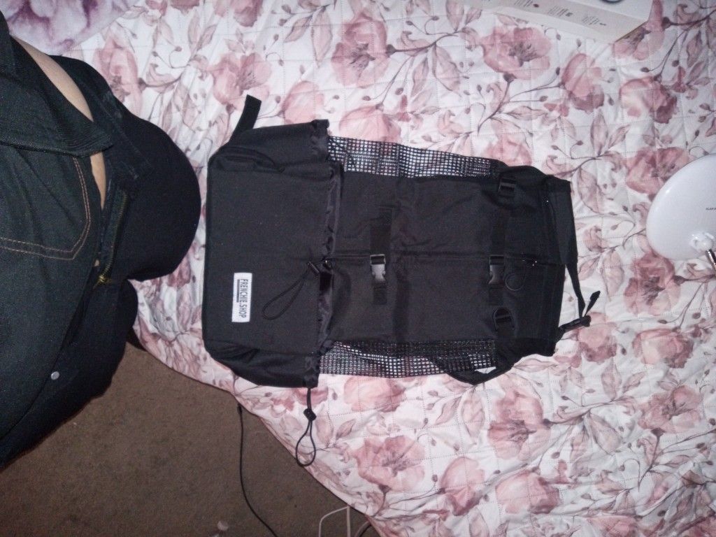Large black backpack with Ventilated cooling side panels, side and front pocket Sternum strap avalanche whistle clip shoulder straps