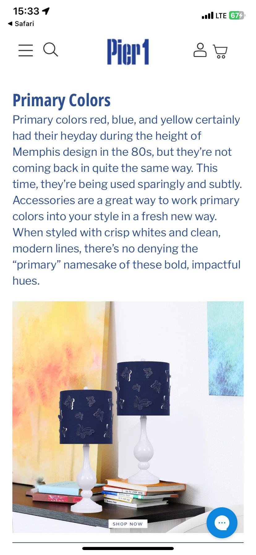 Pier1 Table Lamps 2 White base with blue butterflies patterned shades.