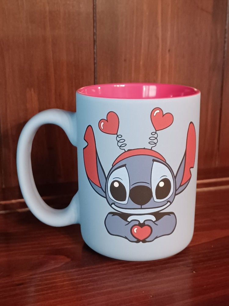 Disney's Stitch Valentines Mug, with heart hat. Zrike Brands, Blue 18oz. Ceramic Coffee/Tea mug.