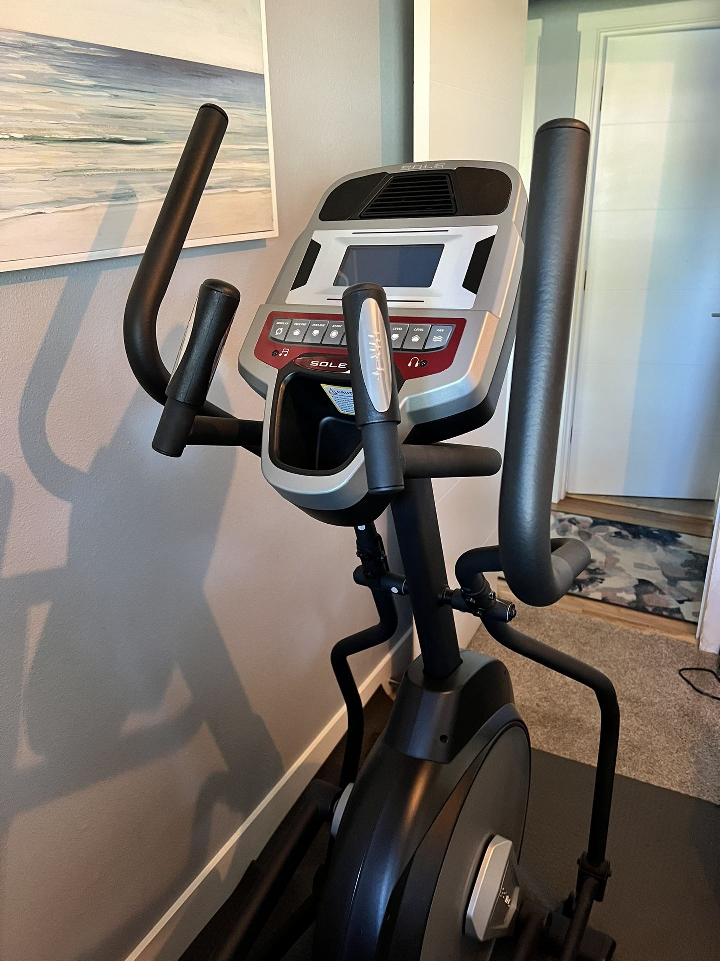 Selling my Sole E20 elliptical. Works perfectly, smooth and quiet, just don’t use it anymore. ✅ 20" stride, multiple resistance levels ✅ Sturdy + comfortable ✅ Built-in fan for cool workouts ✅ Built-in screen for speed, time, calories, etc. ✅ Low-impact, joint-friendly workout Asking $50 (open to reasonable offers). Equipment mat shown included. PICKUP ONLY — bring a friend, it’s heavy!