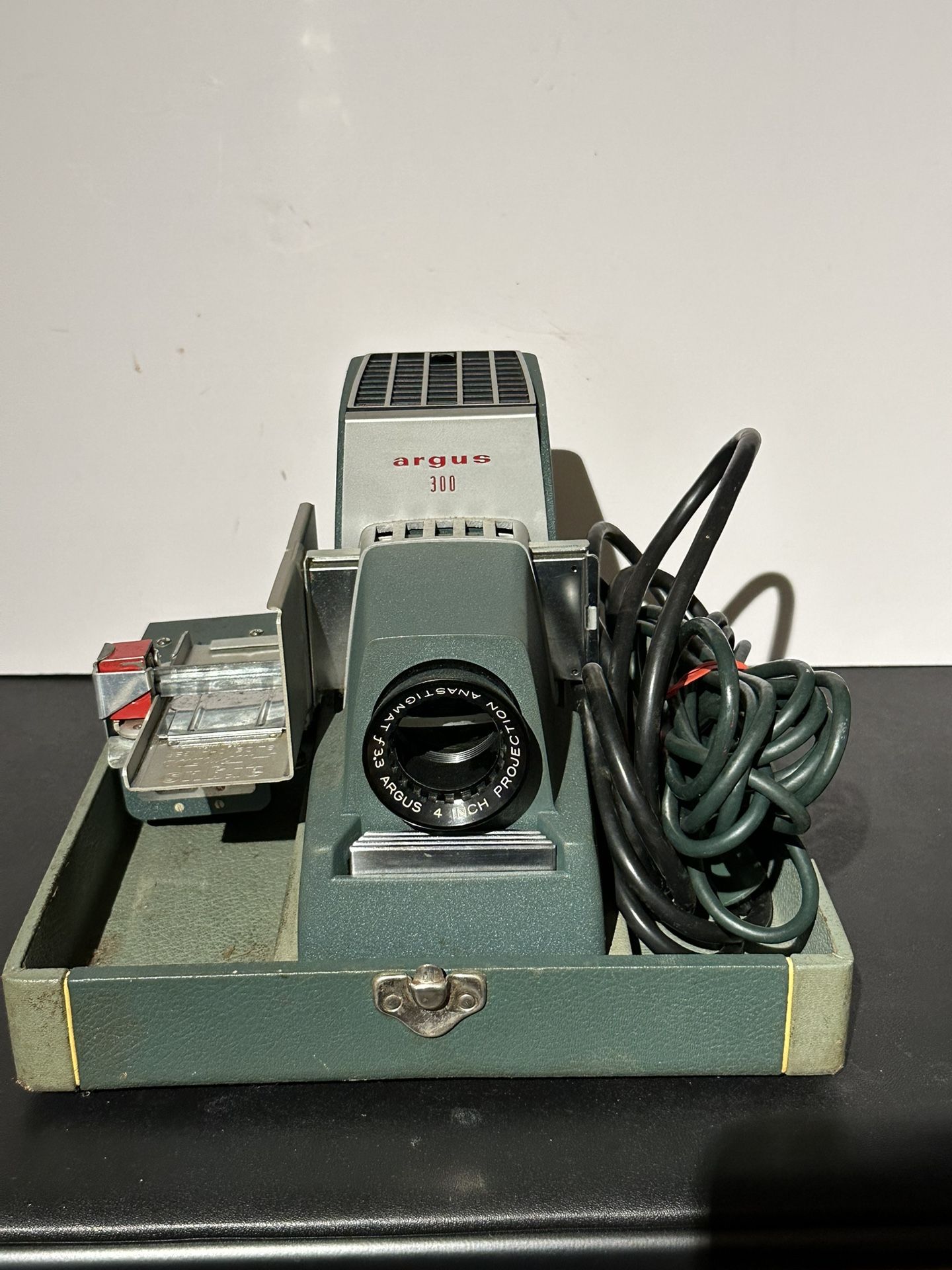 Vintage Argus 300 slide projector in original hard case. Tested and working. Great for viewing old 35mm slides, decor, or collectors. Includes: Argus 300 slide projector Argus 4-inch f/3.3 Anastigmat projection lens Original hard carrying case Power cord Slide tray/holder shown in photos (included) Condition: Works properly Normal cosmetic wear from age/storage (see photos) Clean overall and ready to use