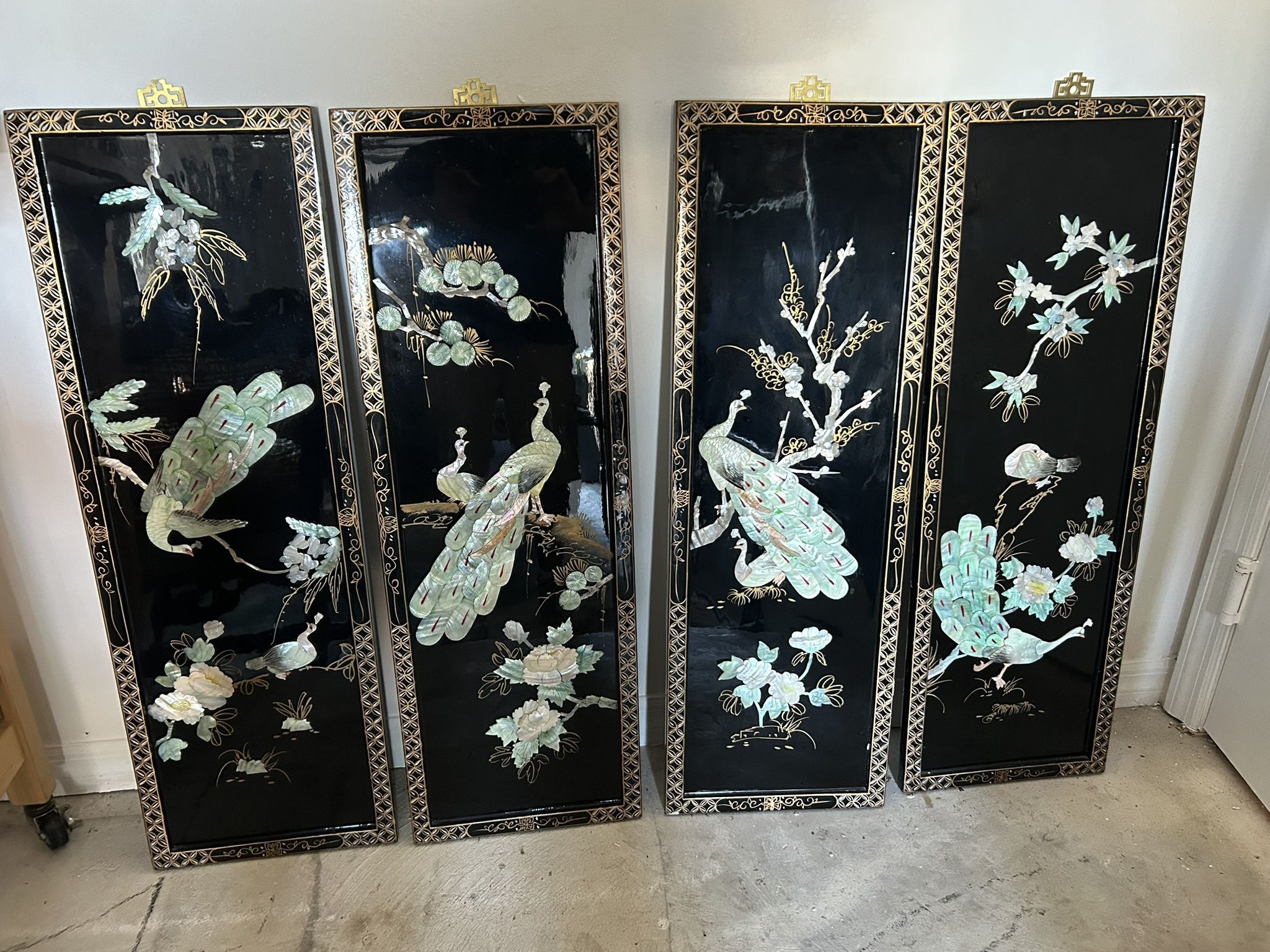 (4) separate black lacquer wall panels Oriental with Mother of Pearl Each panel 36” L x 12” W