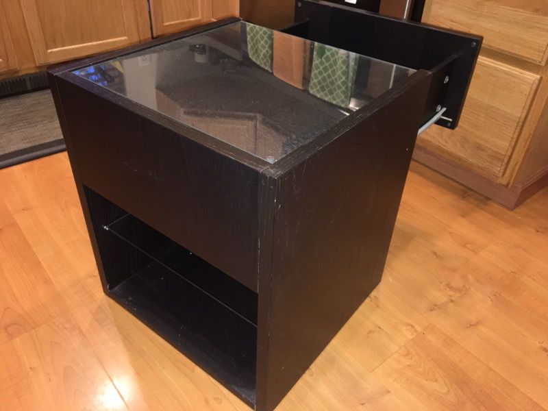 This is a beautiful and table, nightstand, has one slide out drawer, glass top, with another glass shelf right below the drawer, it is 20 inches tall by 18 inches wide by 18 inches deep 20 X 18 X 18