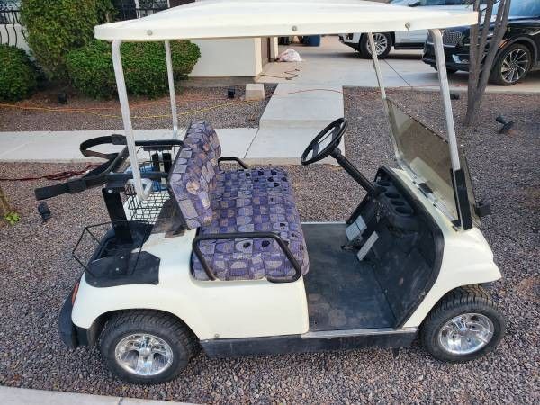 2001 Yamaha golf cart 4-stroke. Street legal with horn signals and windshield. Never have to worry about charging batteries or replacing batteries. Also does not smoke like the two-stroke golf carts. Very easy to drive. Nice aluminum wheels. Call for details 48O..738,,33,,56 Willing to deliver within 20 mi radius of Mesa with full price offer