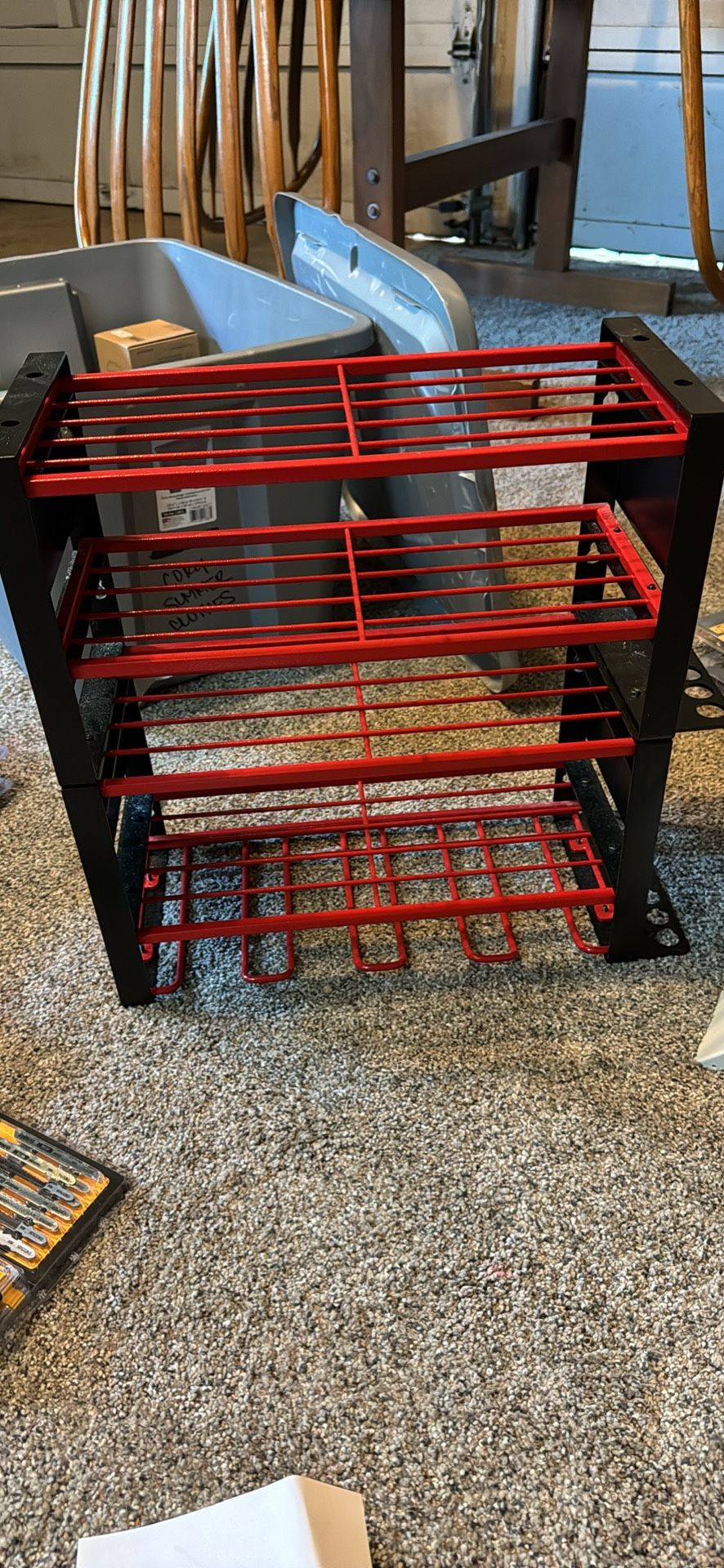 power tool racks there’s actually two here i just stacked them i have the extra bottom for more power tools. They’re new I just never got to hanging them as I moved