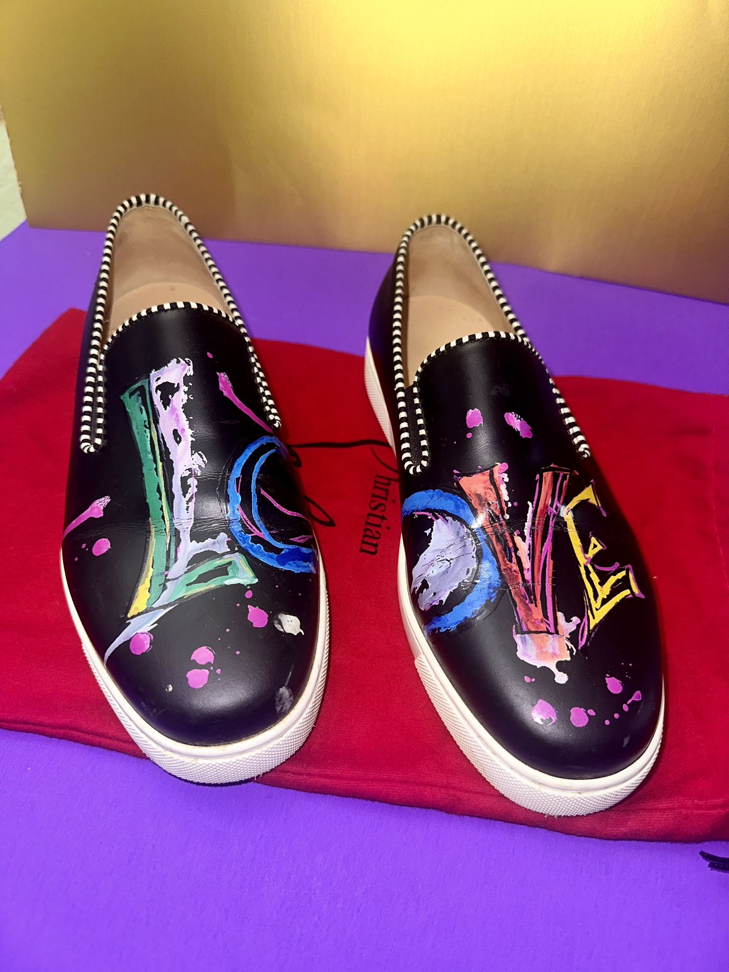Authentic CL - Size 38.5 No box, only includes one dust bag. I’m also selling two pairs of CL Wedges in nude & black in Size 38. Slip-on sneaker silhouette Black leather upper with black and white striped piping Multicolor graffiti "LOVE" print on uppers Round toe Leather insole and lining Flat heel Red rubber outsole See pictures for crease usage, still in great condition. Shoes show signs of wear, including minor scuffing on leather uppers and minor scuffing/wear on midsoles and outsoles.
