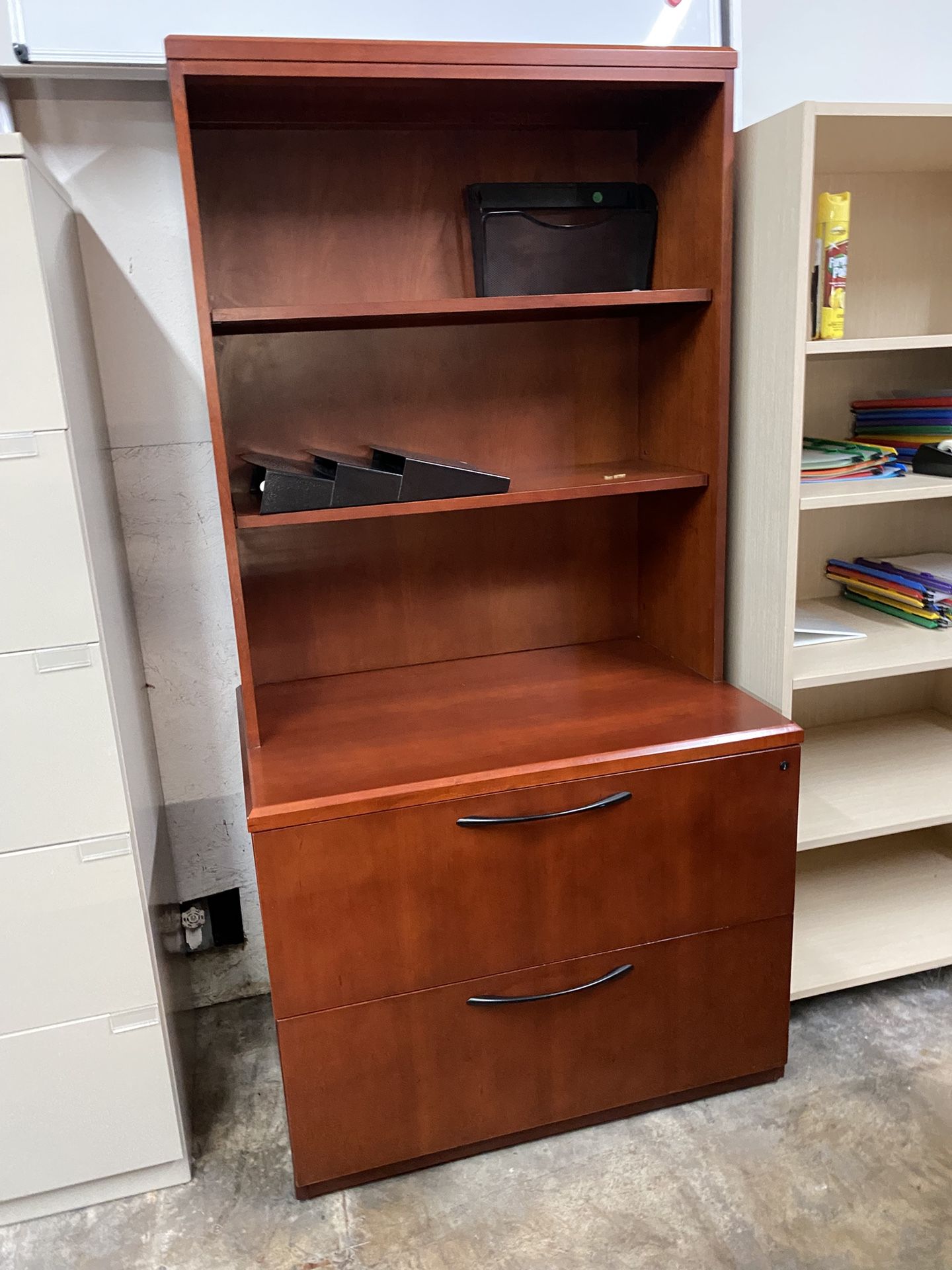Allsteel 2 drawer lateral file cabinet with hutch, commercial grade, wood in cherry finish, file hanging frames, fit letter or legal files, lock with key, dimensions : 36” wide x 24” deep x 71” height