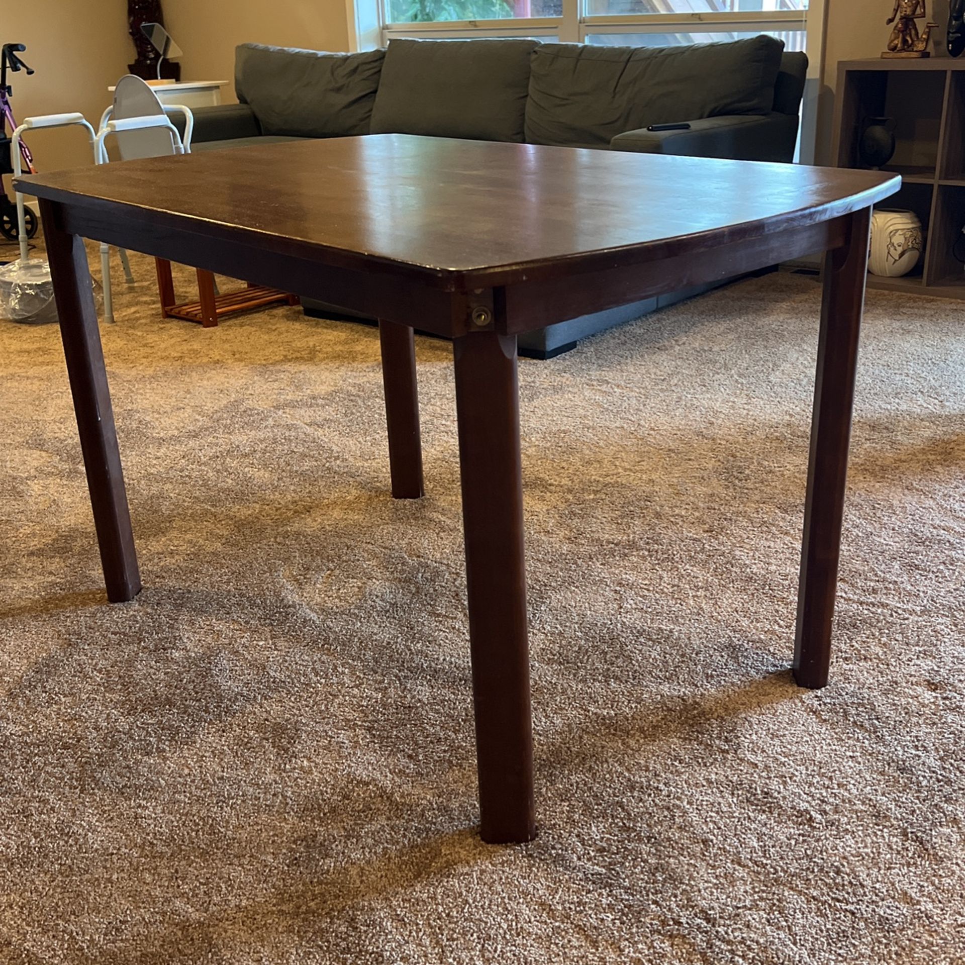 48” L x 30 “ W x 29 1/2 “ H Sturdy wood table. Fair cosmetic condition. Scuffs and blemishes pictured. Normal wear.