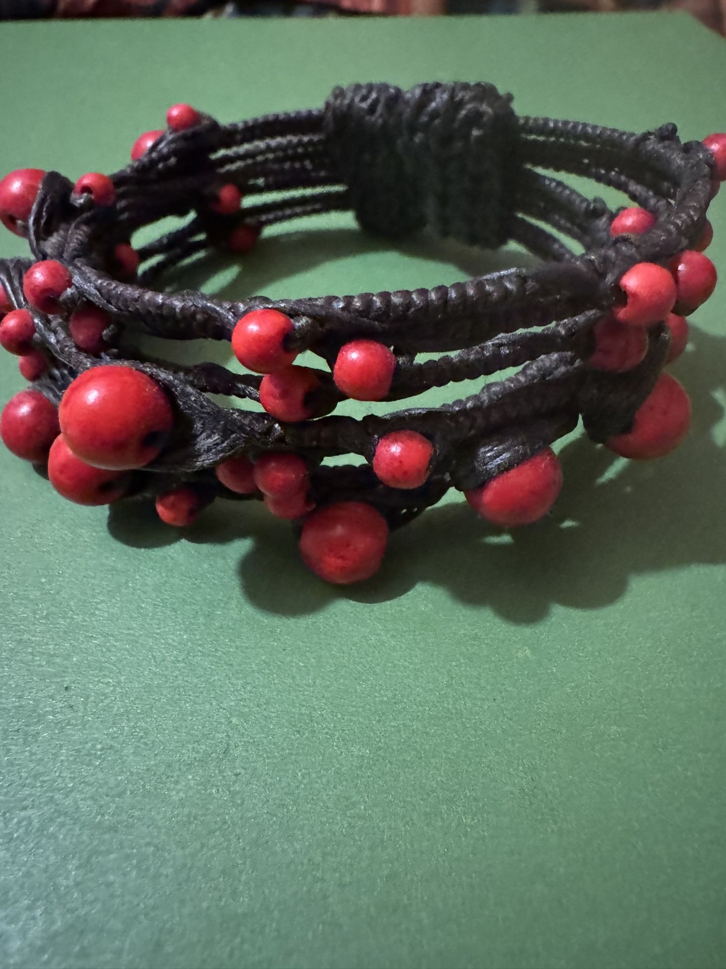 Brown & Coral Red Bead Bracelet on wire construction so fits wrist nicely