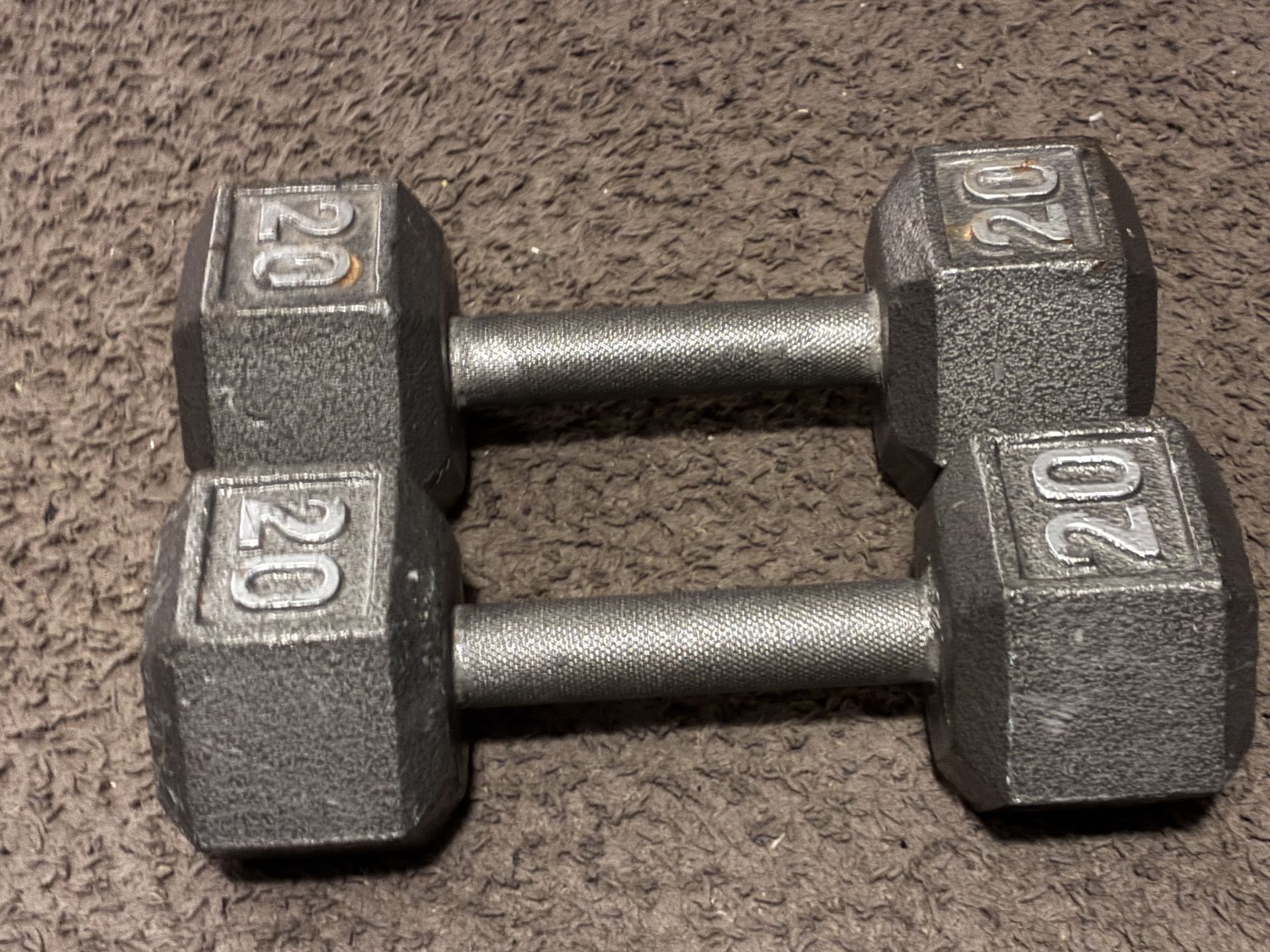 Pair of 20 lb Gray Cast Iron Hex Dumbbells For Weight Lifting & Training Used, kind of dirty