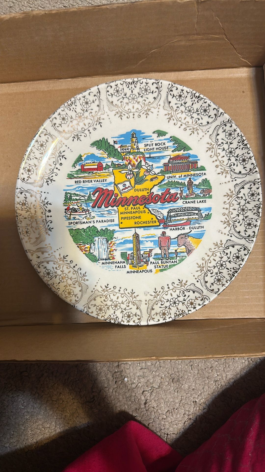 This is a vintage souvenir plate from Minnesota, featuring various landmarks and attractions of the state. Description: It's a ceramic plate with a gold trim, showcasing hand-painted or transferred scenes of Minnesota landmarks like Split Rock Lighthouse, Paul Bunyan Statue, Duluth Harbor, Red River Valley, University of Minnesota, Minnehaha Falls, and more. Condition: These vintage plates are often found in excellent condition, though some may show minor wear consistent with age, such as slight gold trim wear. Collecting: These plates are popular among collectors of state souvenirs or vintage decorative items, and they can be displayed as wall décor.