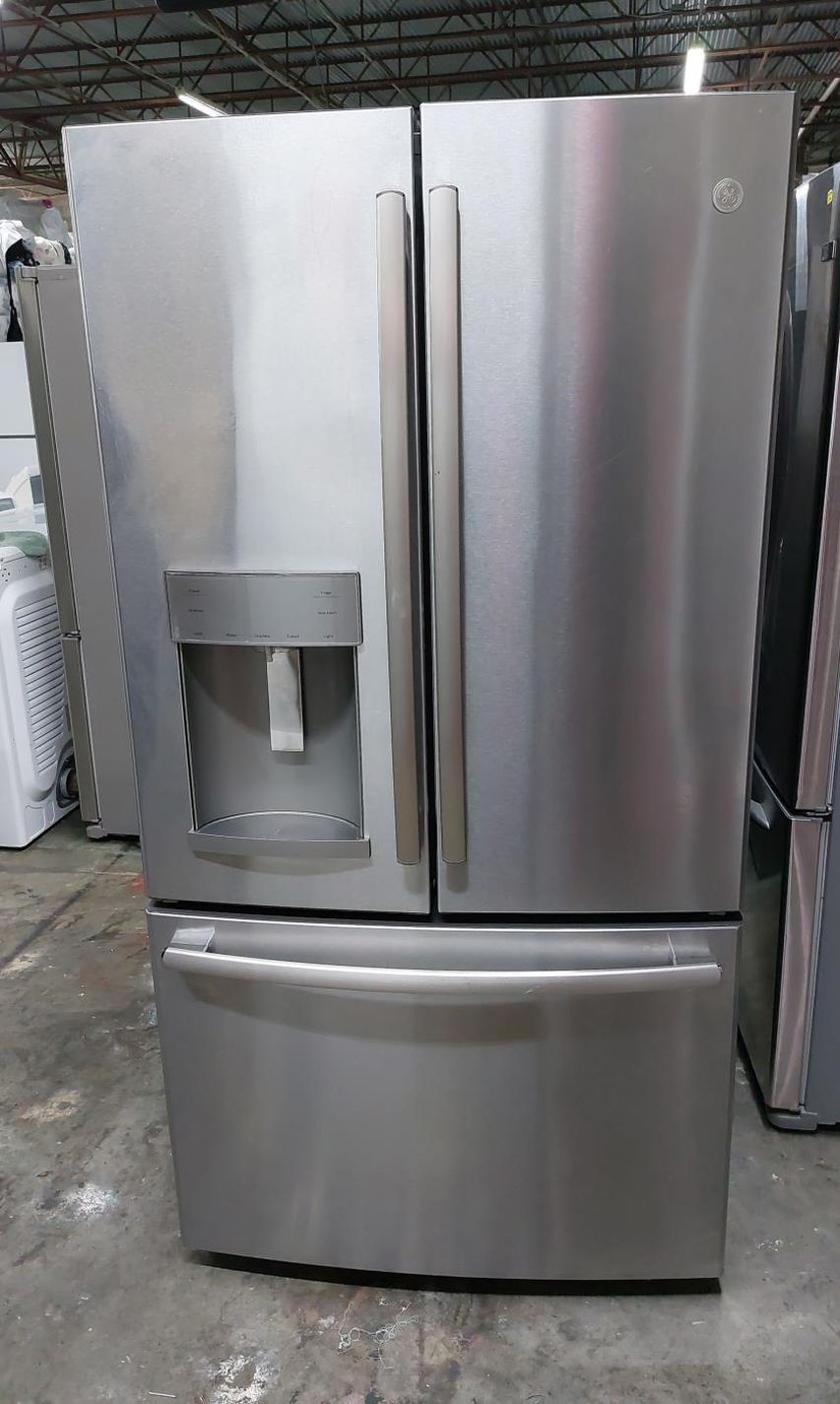 This GE 3-door refrigerator in stainless steel offers a sleek design with French doors. The condition is excellent with only minor surface scratches. Inside, you'll find a clean and well-organized setup with climate zone drawers and spill-proof shelves. Comes with 60-day warranty. Same day delivery available. DM / Message us for more info. Hablamos español.