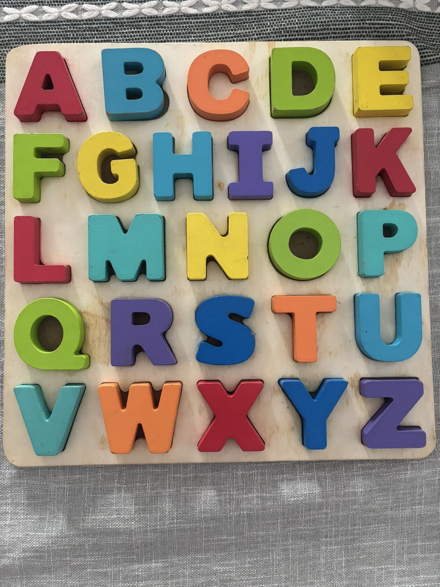 educational toy recommended for children 18 months and older. A great way to learn the alphabet in easy steps, it is crafted in high quality wood and includes the 26 letters of the alphabet. The letters are brightly colored in brilliant shades of red, orange, yellow, green, blue indigo and violet. This alphabet puzzle develops and enhances both fine and gross motor skills and improves hand-eye coordination. Made with FSC certified wood the gold standard in the toy industry. Well loved but has all the pieces Porch pick up in Copperfield 77084
