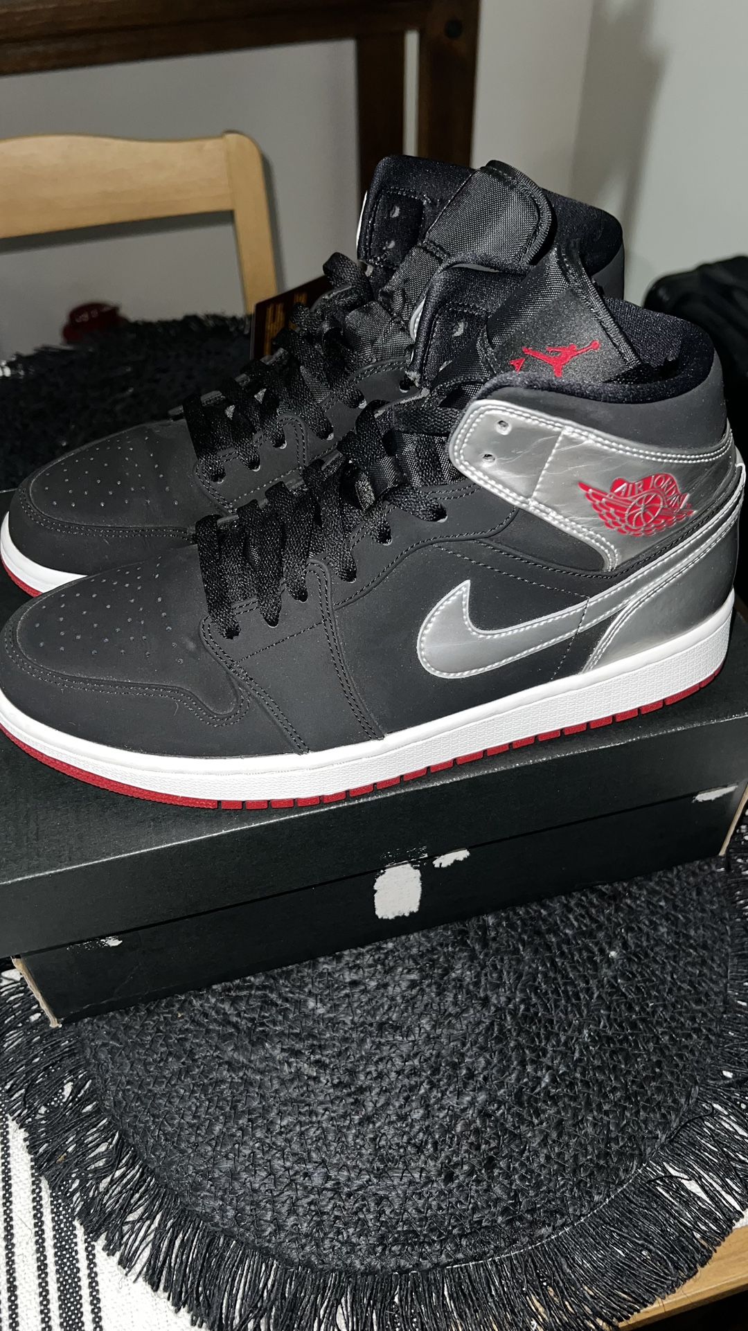 Size 9 suede. Black/ Metallic/ Red