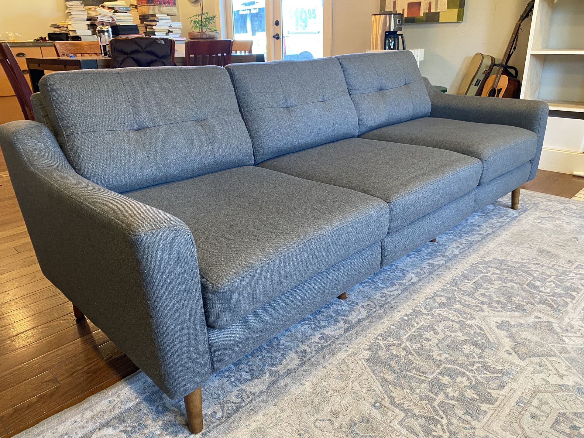 Burrow brand sofa. (https://offerup.co/faYXKzQFnY?$deeplink_path=/redirect/) Pretty sure it is the Nomad model. About 7 feet wide. Charcoal color. It’s a stylish, super durable fabric and is in great shape. We just got something bigger and don’t have the space for it. I can help you load it.