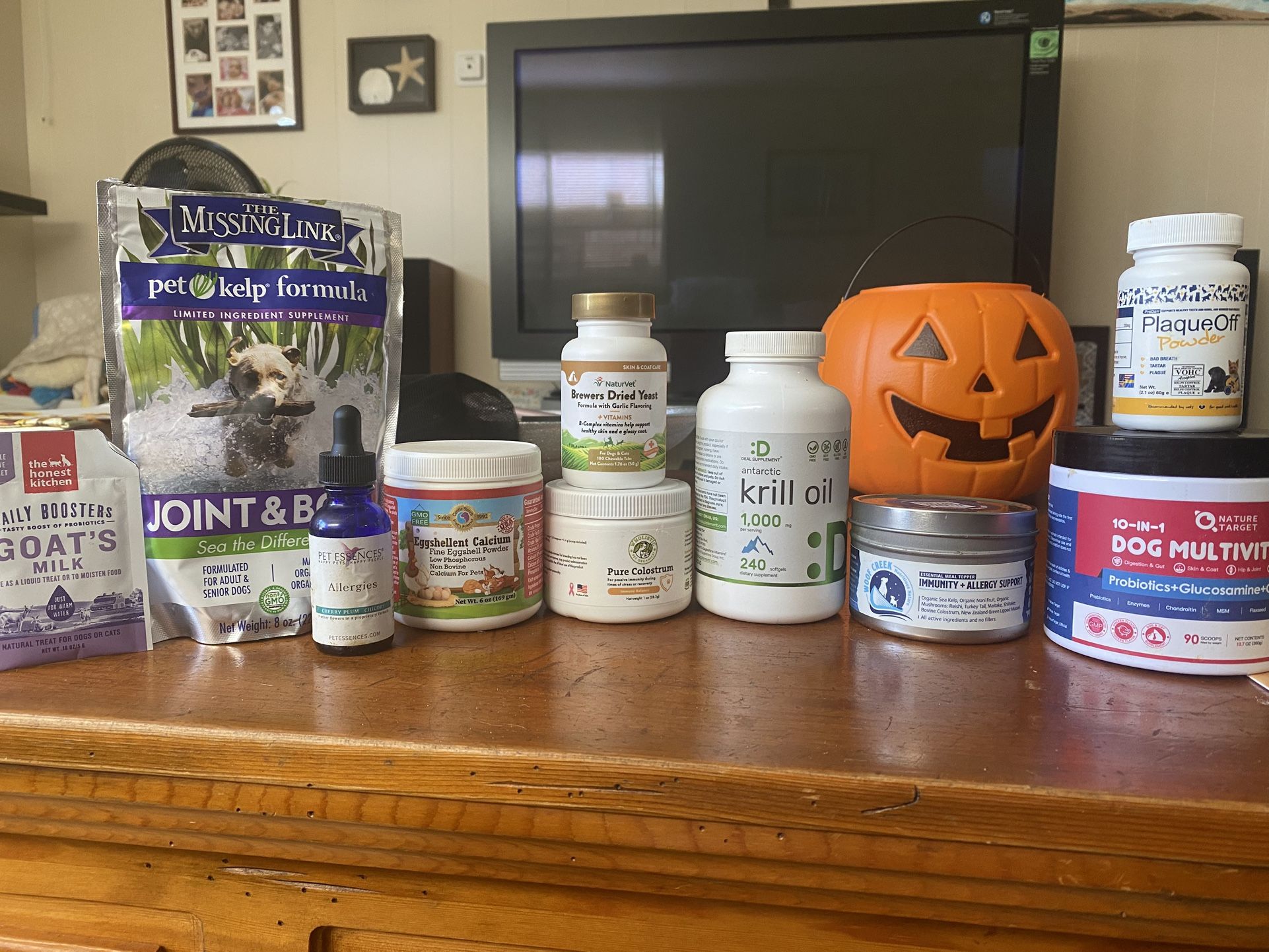 Hi there here are some top name brand organic dog supplements. They have not expired and have been stored in a cool dark place to keep fresh. Most of them are still new or almost full and some that are used would be good testers to see how your dog reacts. These were pricey supplements but I’m selling the bundle for $30