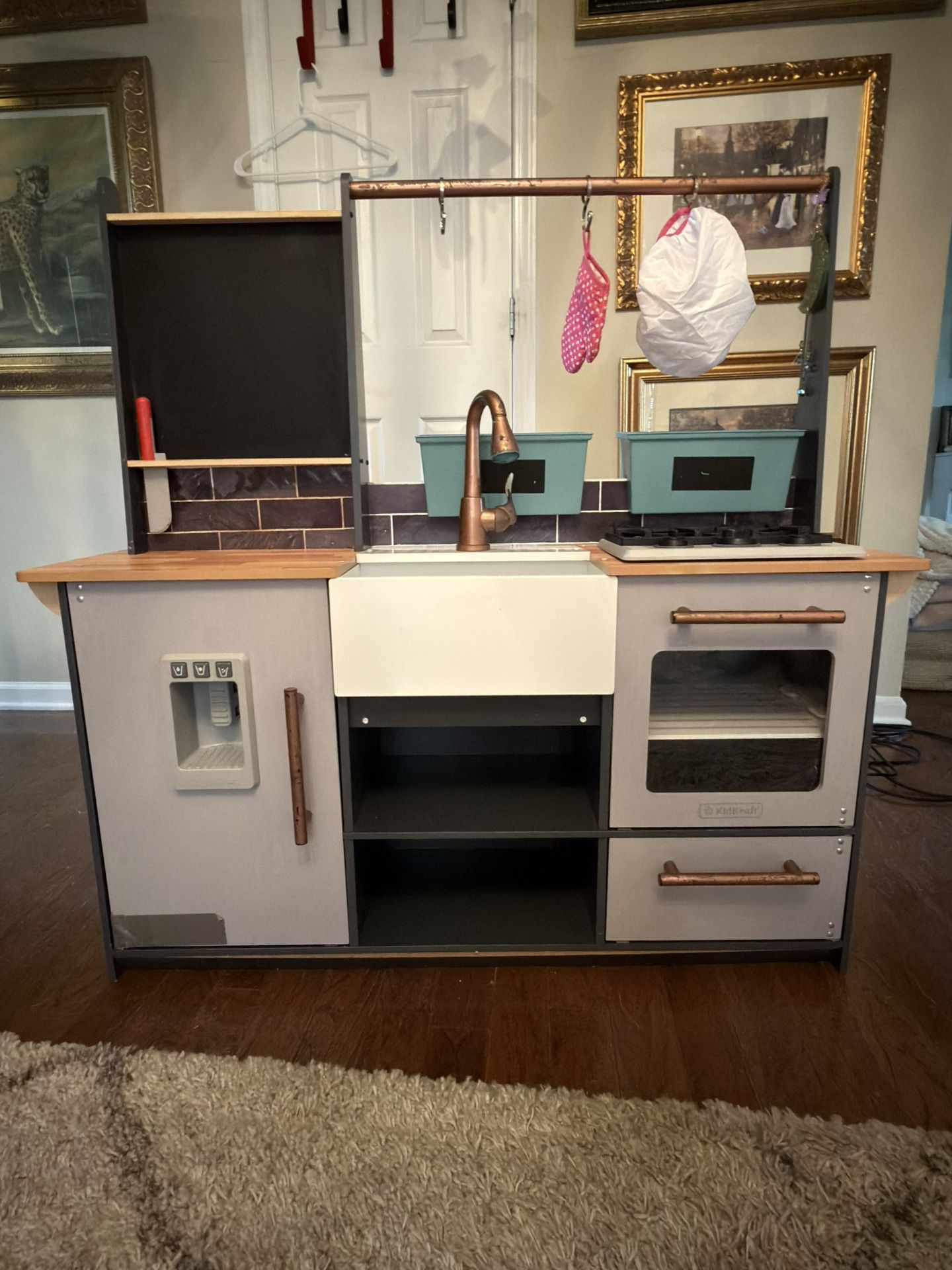 Stove top makes noise just needs new batteries. (Requires a tiny Philips head to open batter box) like most toys. Stater kit for food toys and tea set. Everything wiped down and cleaned. Ready for new home. My son and daughter have had countless hours of fun with this. They are just older now and it’s just taking up space. -Note there is tape at the bottom of one of the doors. And I painted the handles and faucet to my liking so that needs a new coat. But everything works as it should. **Honest description for an honest review. Serious inquiries only please. Thank you kindly! ((Smoke-free home))