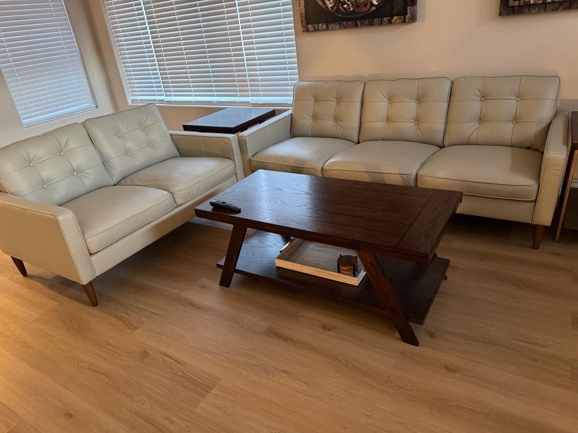 ✅Living spaces ✅ Grayson Natural Taupe/Leather 2 Piece Tufted Sofa & Loveseat Set Perfect condition no scratches no stains perfect and clean. Used for only 2 months. I paid $2175 + tax for them. Asking price $1849.99 or best offer.