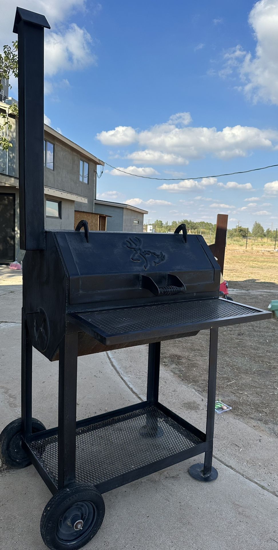 20” x 30” bbq pit with wheels. Custom hunting logo in cover. Made with 3/16” metal