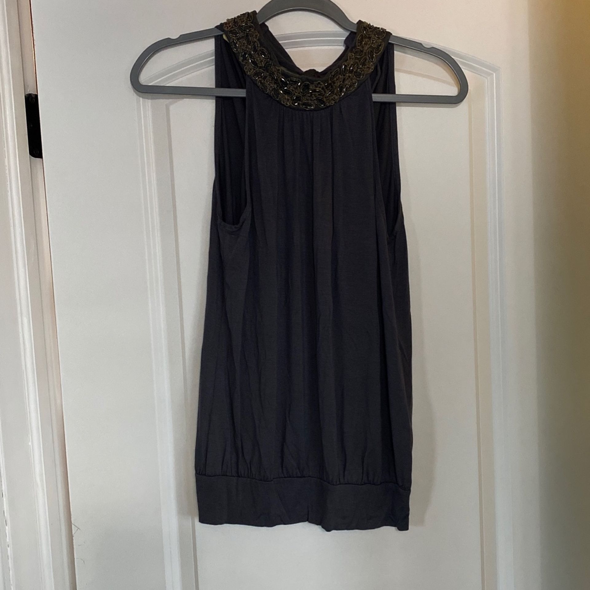Grey tank top with beaded collar and cute tie in back.