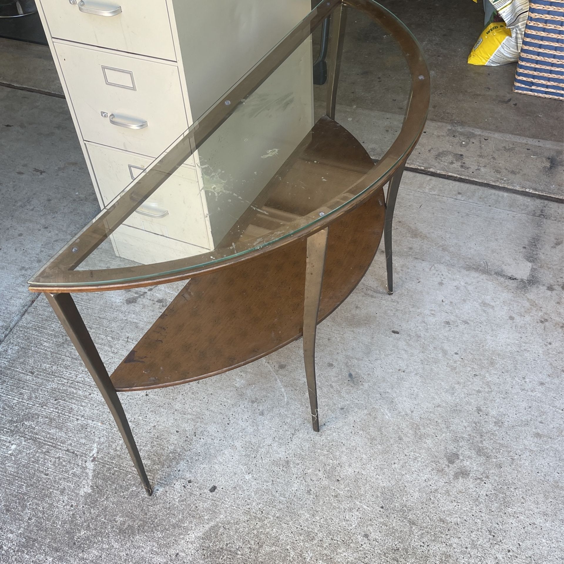 Glass and metal beautiful piece beautiful piece needs cleaned up. I love the bronze color but if you don’t easy to paint any color, you’d like half moon stand. beautiful for entryway, hallway