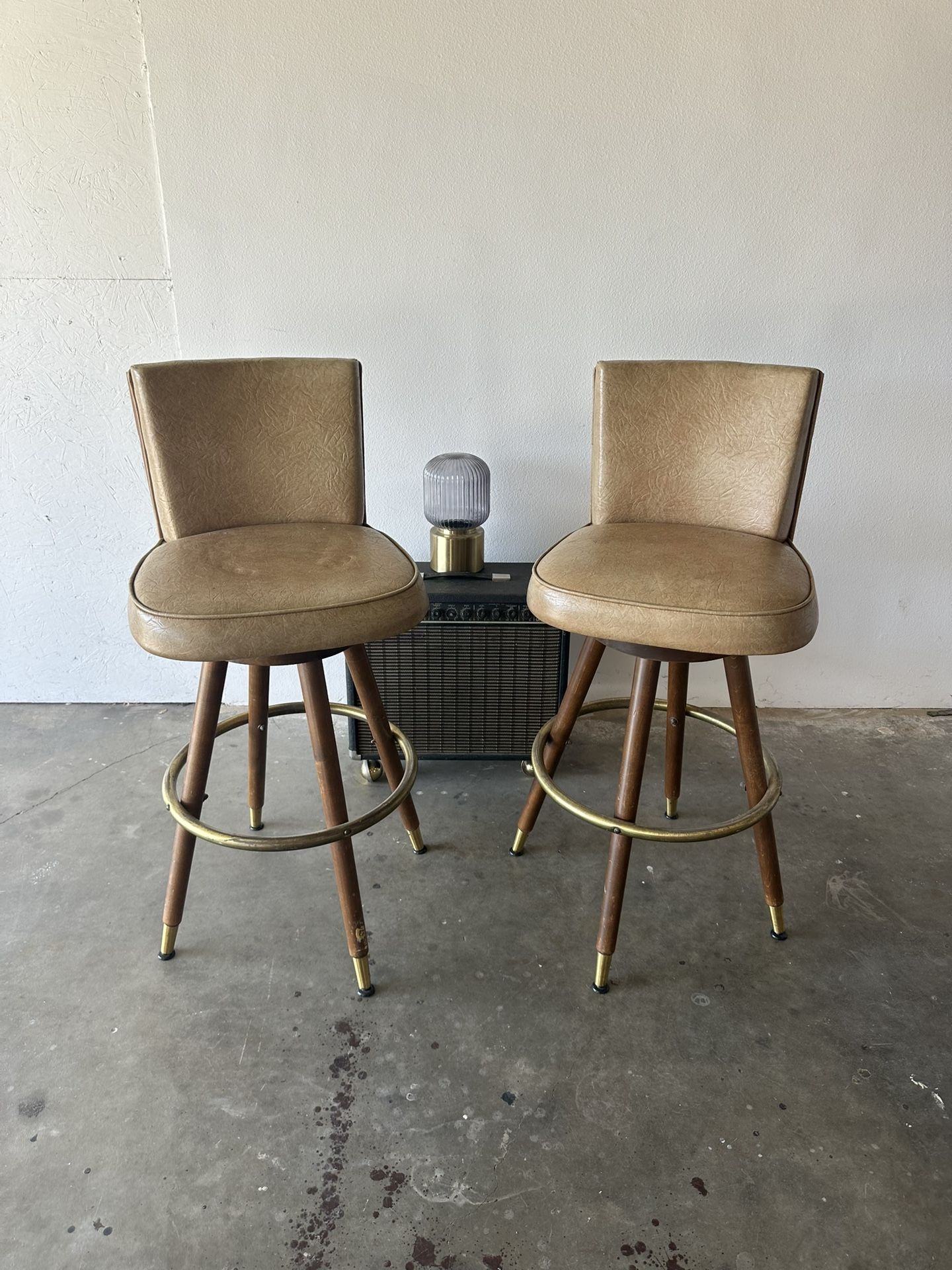 Brown spin , work great . Sturdy . Vintage style wood backing and gold foot rim Wood legs . Both for sell together Sillas de barra