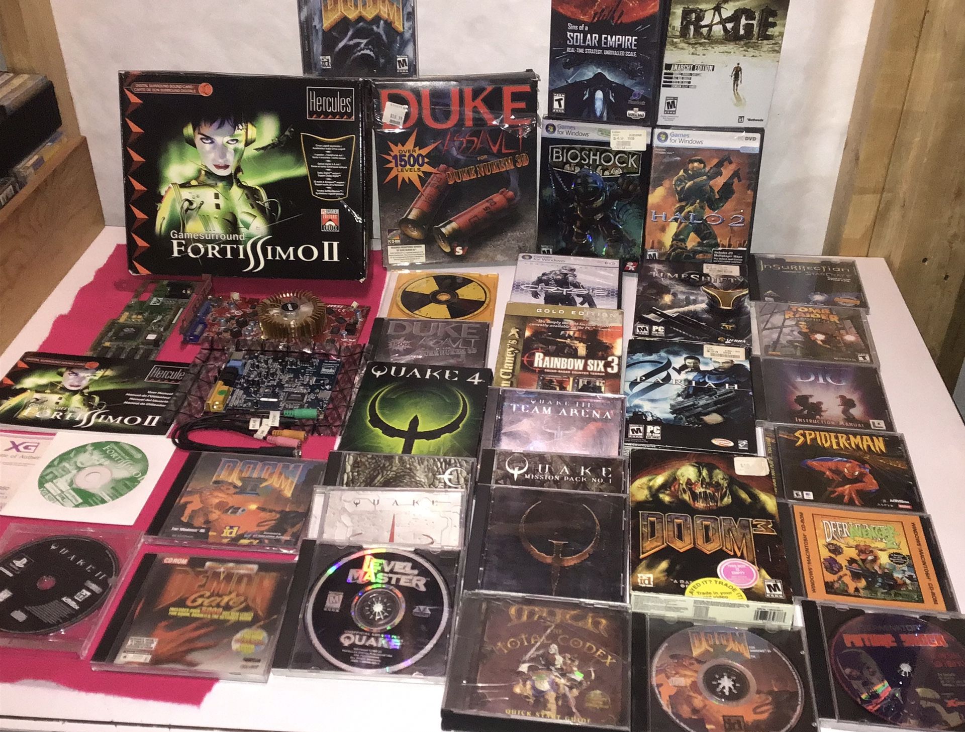 30 games for windows pc windows 98, XP, Windows Vista, Three Video cards Quake 4, Mission Pack NO 2, Arena, Team Arena, Level Master Duke Nukem 3D, Duke Assult 3D Sins of Solar Empire DOOM, DOOM II, DOOM 3, DOOM Collectors Edition, Demon Gate Bioshock Crysis Rainbow six 3 Rage Anarchy Edition Halo 2 Time Shift Pariah Tomb Taider DIG Spider-Man Deer avenger Terminator Video cards: Game surround Fortissimo II MSI N9609GT ASÍ PN 109-49800-10 for 3D Most games are complete with manual All in clean working condition
