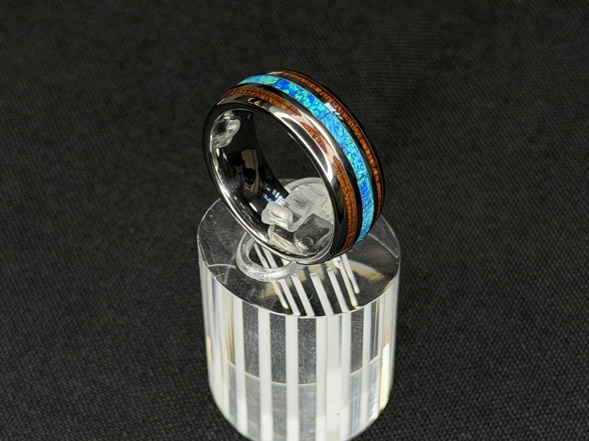 This contemporary tungsten carbide ring features a vibrant blue-green glitter inlay beautifully framed by natural wood veneer accents, creating a sophisticated mix of sparkle and organic texture. The glitter inlay captures light from every angle, producing a dynamic, eye-catching effect while maintaining a refined, modern look. Constructed from tungsten carbide, the band offers superior durability, scratch resistance, and a substantial feel, making it ideal for everyday wear. The polished interior ensures a smooth, comfortable fit, while the precise inlay work highlights the harmonious balance between natural materials and contemporary design. Handcrafted in Hawaiʻi, each ring is unique, with subtle variations in wood grain and inlay shimmer that make every piece one-of-a-kind. Designed for those who appreciate modern mixed-media jewelry, this ring delivers both bold visual impact and enduring quality. Key Details / Specs - Material: Tungsten carbide - Inlays: Blue-green glitter with natural wood veneer - Finish: High-polish band with precision inlay work - Style: Contemporary / mixed-media / statement - Made in Hawaii - Unique variations in wood grain and inlay pattern Bold tungsten ring with a blue-green glitter inlay and natural wood veneer accents — handcrafted and unique from Hawaii."