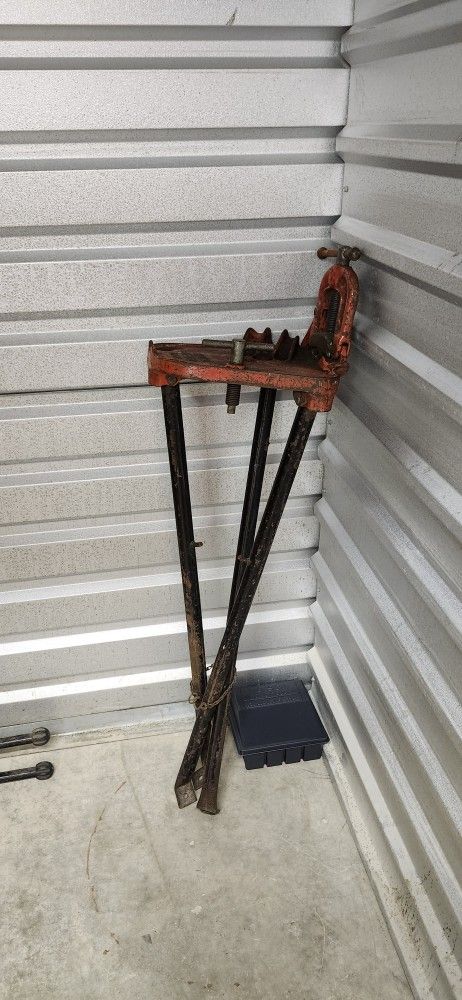 Table has a vice to keep the pipe from moving while you thread. Adjustable horse with roller. 2 tap and die crank wrenches various sizes.
