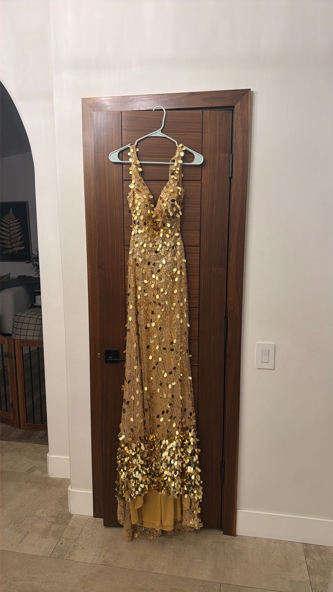 Gold sparkly Sherri Hill dress, size 6 with open side and back with sequence.