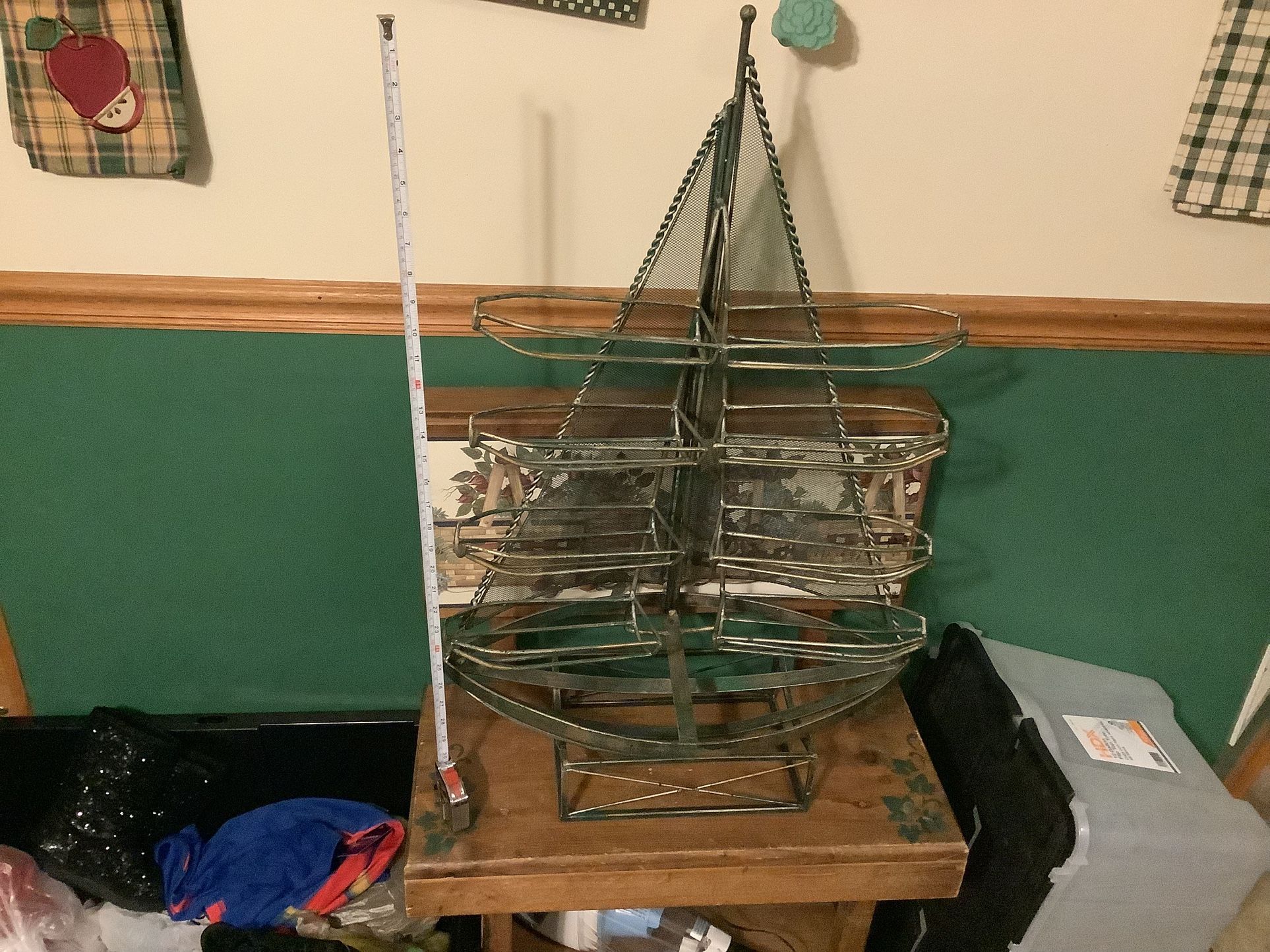 Wrought iron metal free standing sailboat, ship boat wine rack, 32” tall, 18” wide, 10” deep holds 8 bottles of wine, free standing, made of forged m