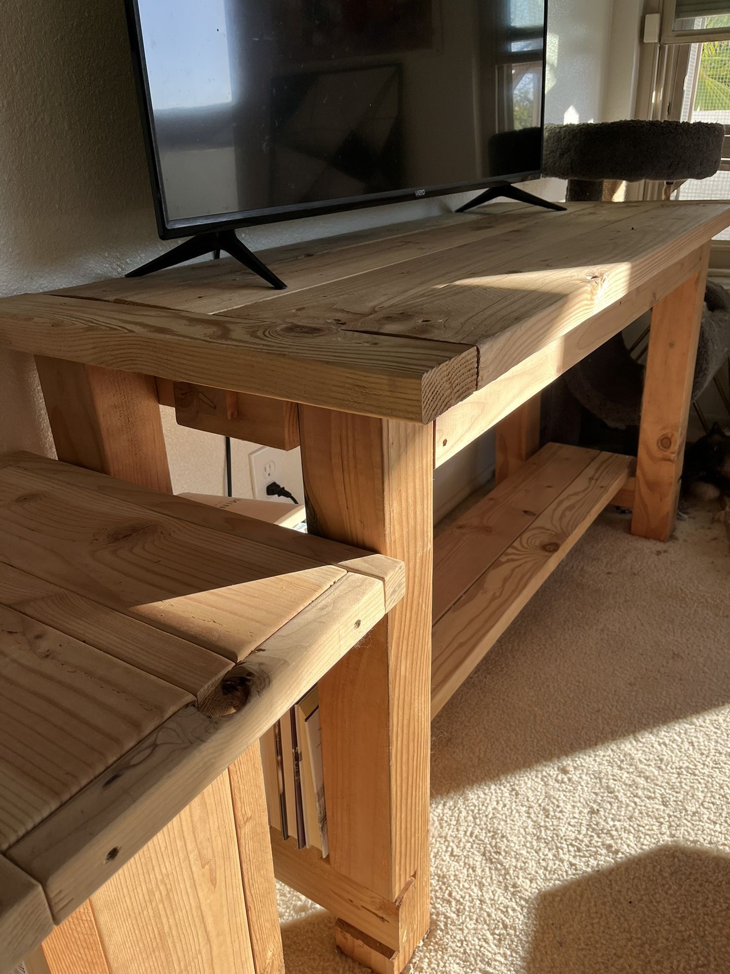 Made with solid wood. Sturdy with even legs. No wobble. Built by me. Still bare wood. You can stain it to any color you like or keep the bright fresh wood aesthetic. I will sell end table and big table together for $160 Asking $120