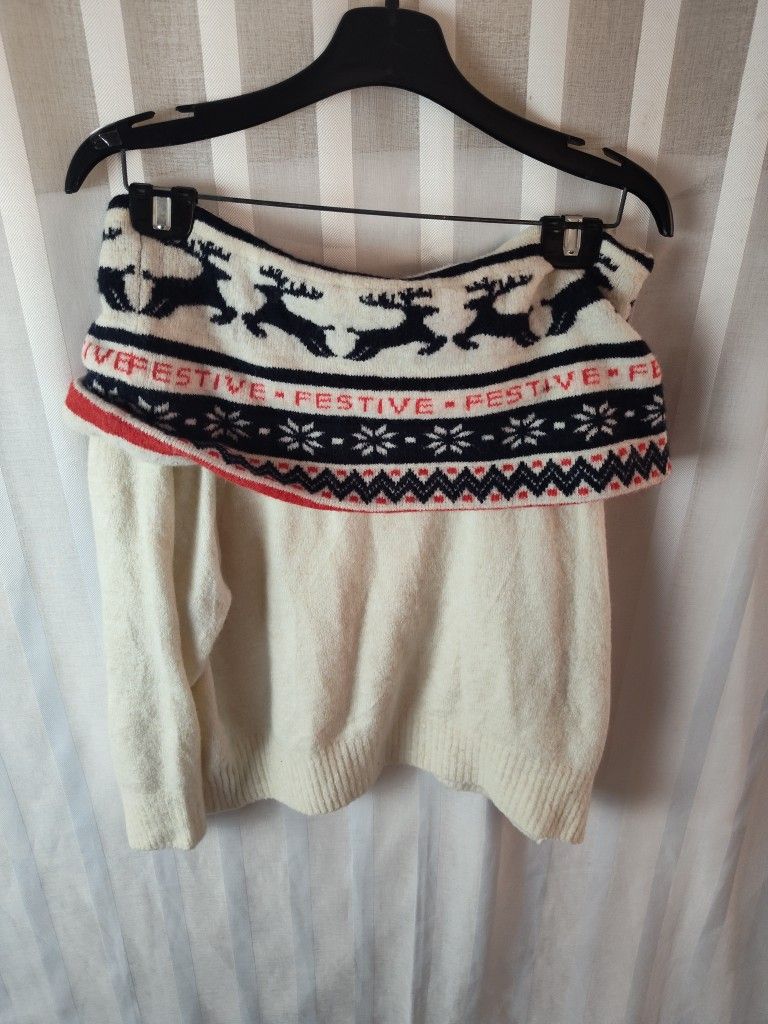 H & M Sweater XXL Ivory Red Navy Festive Christmas Fair isle Off The Shoulder Reindeer Snowflake Pattern