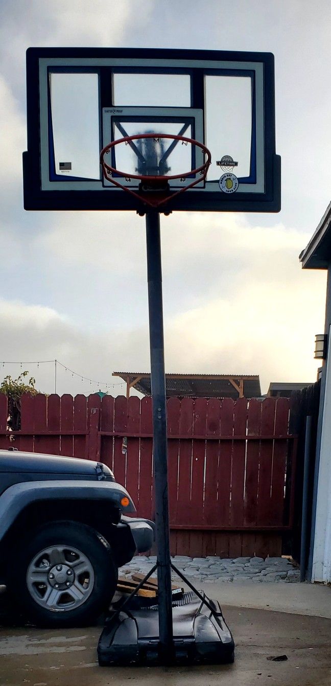 Portable Basketball hoop. Adjustable height. Comes with extra black rim with netting. Easily rolled if needed to move. Weighted down with water or sand. In good condition. $25