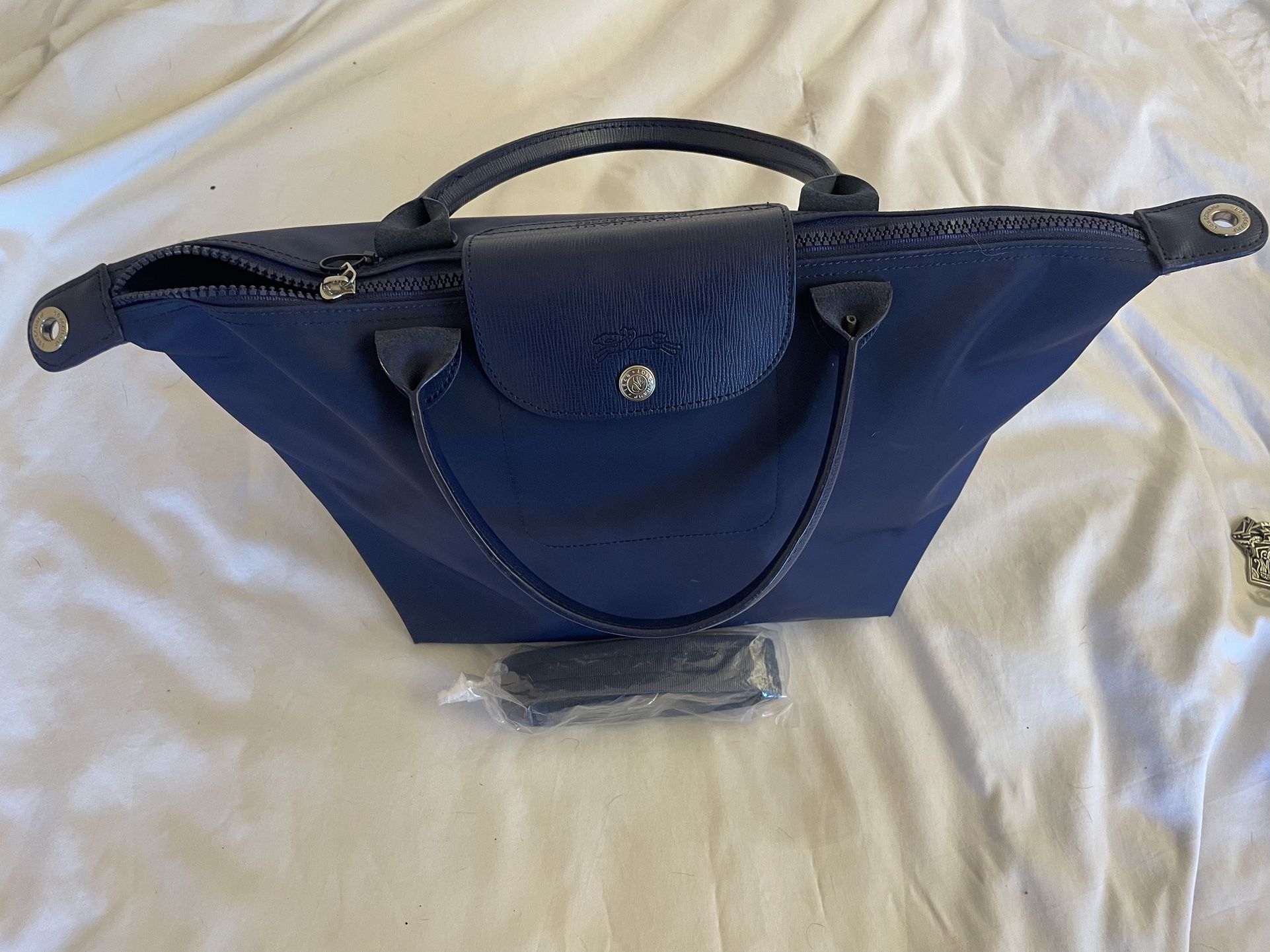 Longchamp Modele Despose Large Blue/Purple Nylon / Leather Tote 17" x 10"x 7" Coated. Minor creasing see photo Missing pulley Will only meet you at the courthouse or police station otherwise will ship.