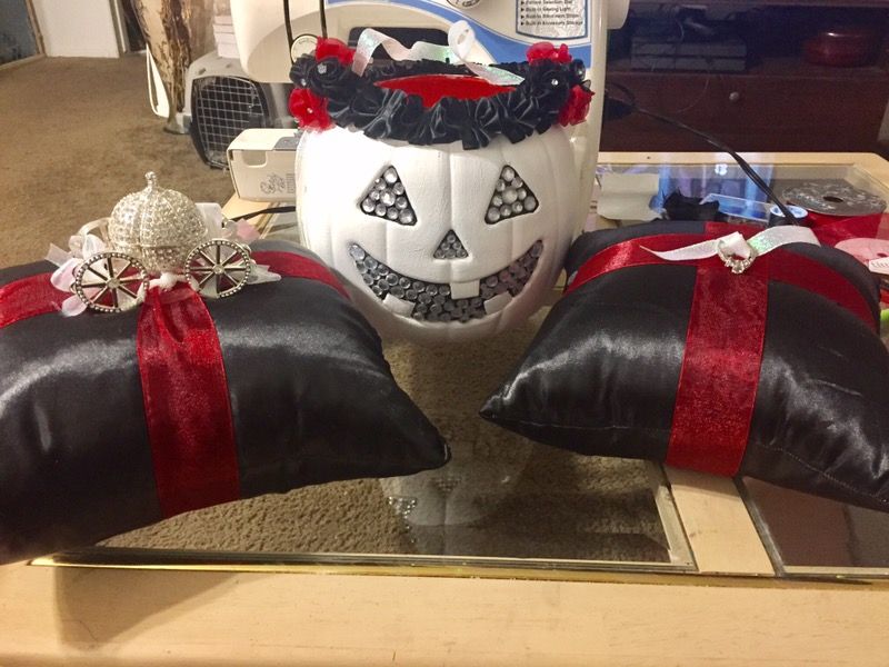 Handmade black and red wedding pillows and pumpkin flower girl bucket
