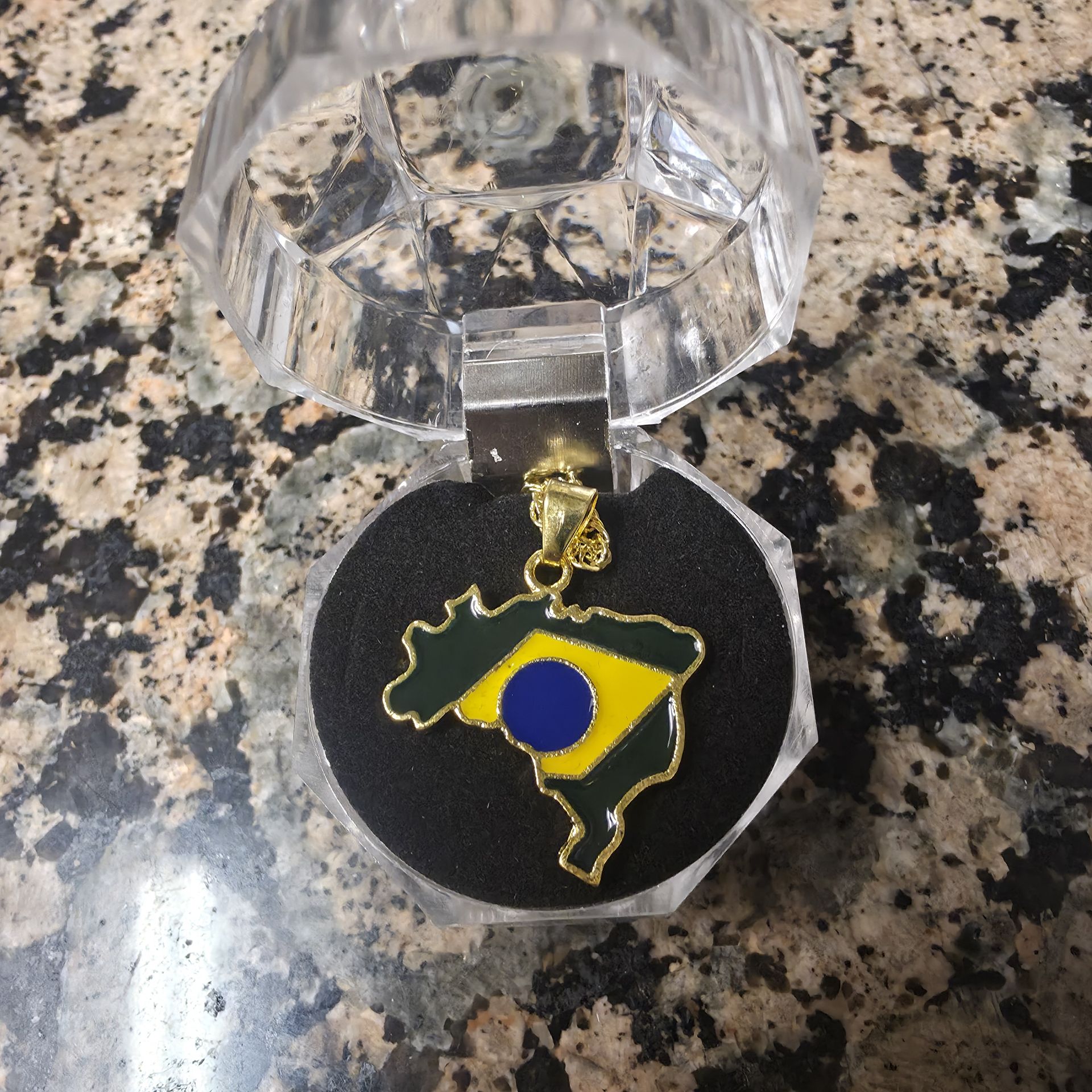 Vibrant Brazil map pendant. Gold-tone metal has enamel flag colors. Comes with clear display case.
