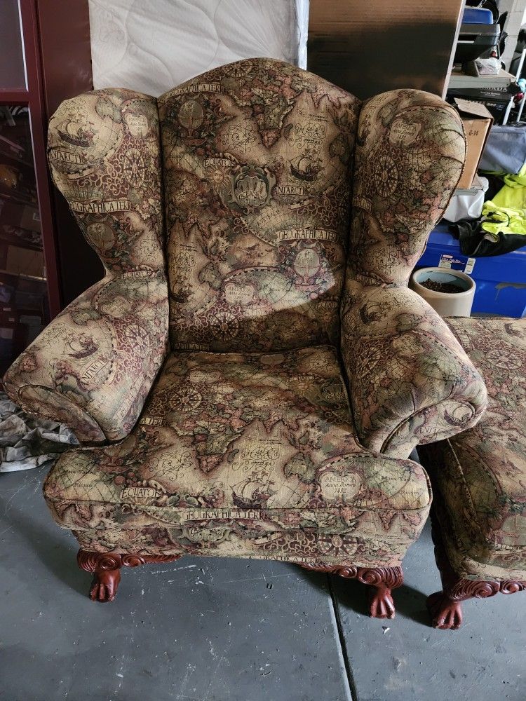 Chair with Ottoman, second picture shows design. Great condition very comfortable. Multiple colors. Mahogany claw feet.