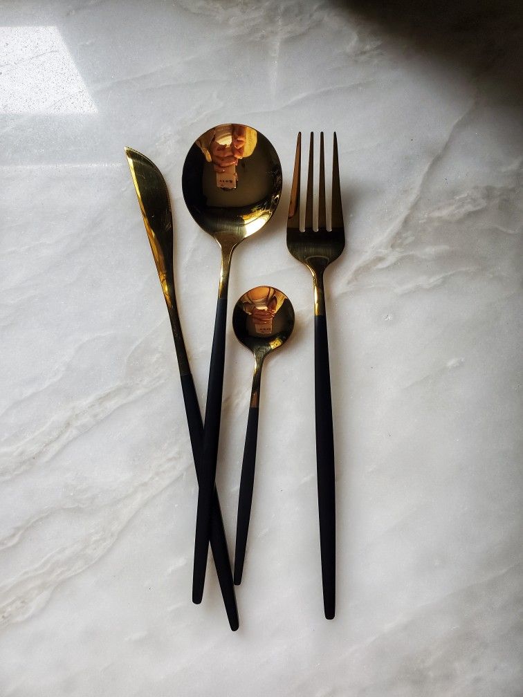 New French Modern stainless steel black and gold flatware utencil 24 pieces set.