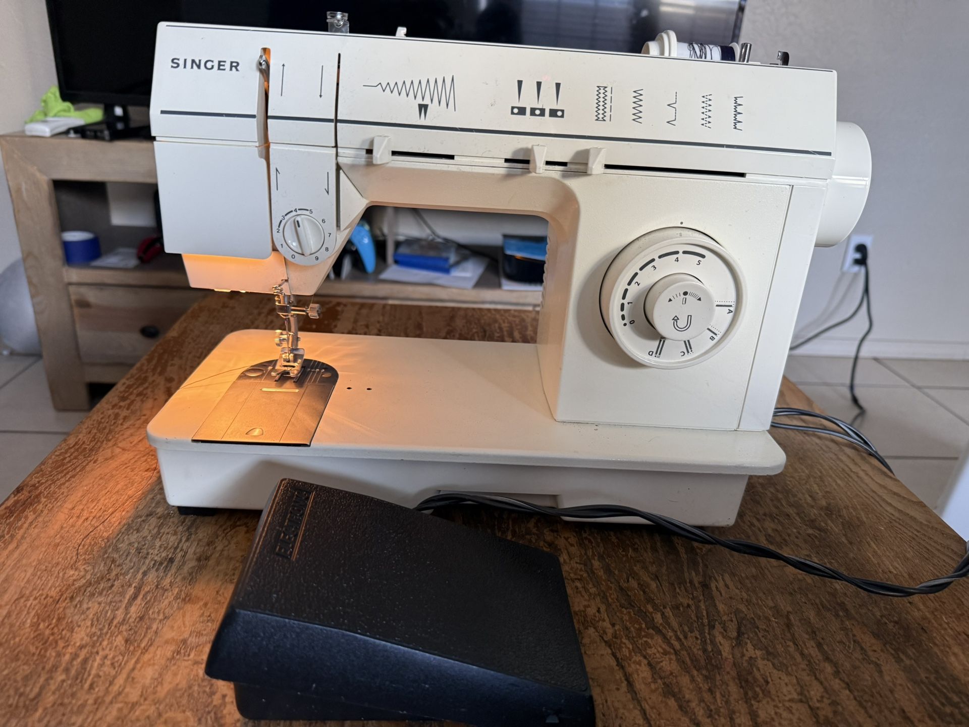 Singer 4325C sewing machine in good working condition. Runs smoothly and sews properly. Includes foot pedal and power cord. Great for beginners or home projects. Normal cosmetic wear from use.