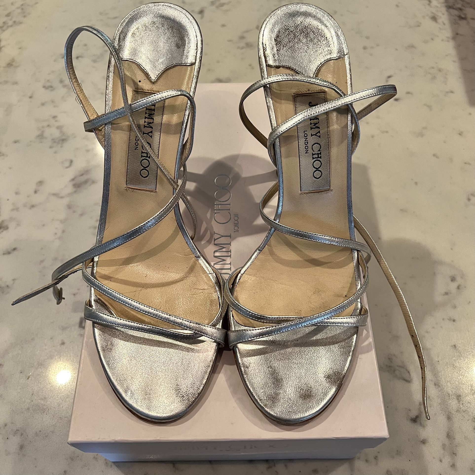 Jimmy Choo Silver Strappy 4” Heels Size 39/8.5