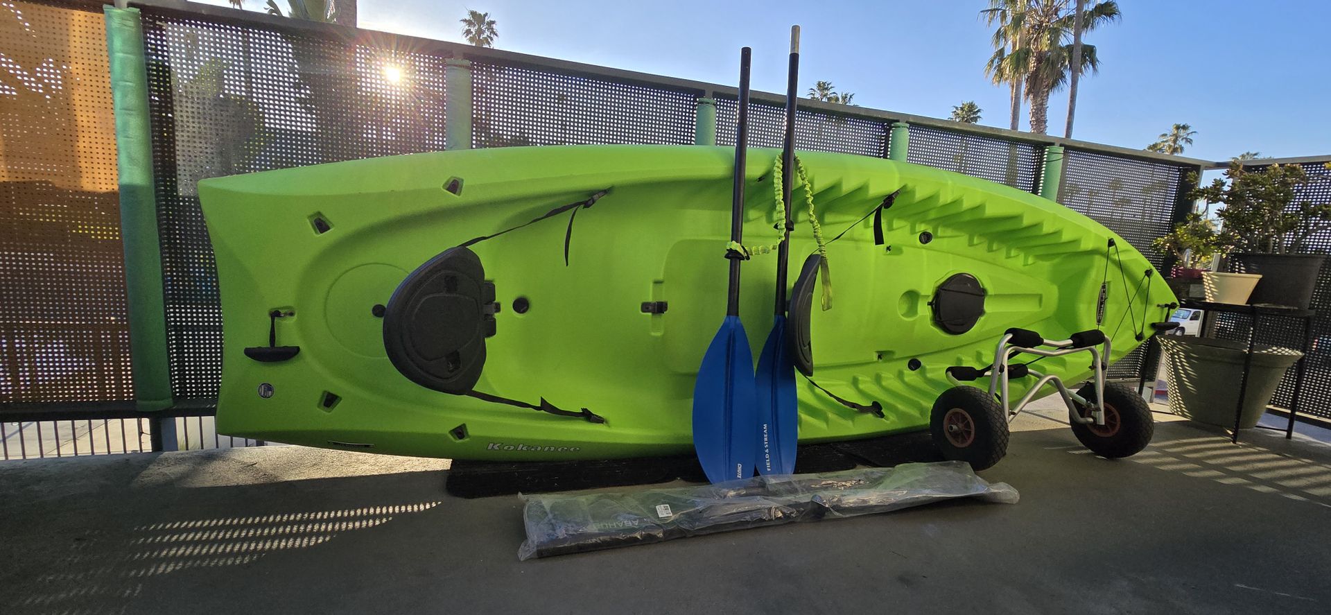 Capacity: Designed for two people, but versatile enough for solo paddling. Dimensions: 10 feet 6 inches in length and 36 inches in width. Weight Capacity: Maximum capacity of 425 lbs. Material: Constructed from UV-protected High-Density Polyethylene (HDPE) for durability. Seating: Includes two adjustable quick-release seat backs. Comes with (2) paddle sets: 1. Field & Stream Chute Aluminum Kayak Paddle 2. Abahub Kayak Paddle, 90.5 Inches (brand new/never used) (1) Kayak trolley (2) Kayak bungee straps for wrists (2) Life Vests (Medium & XL)