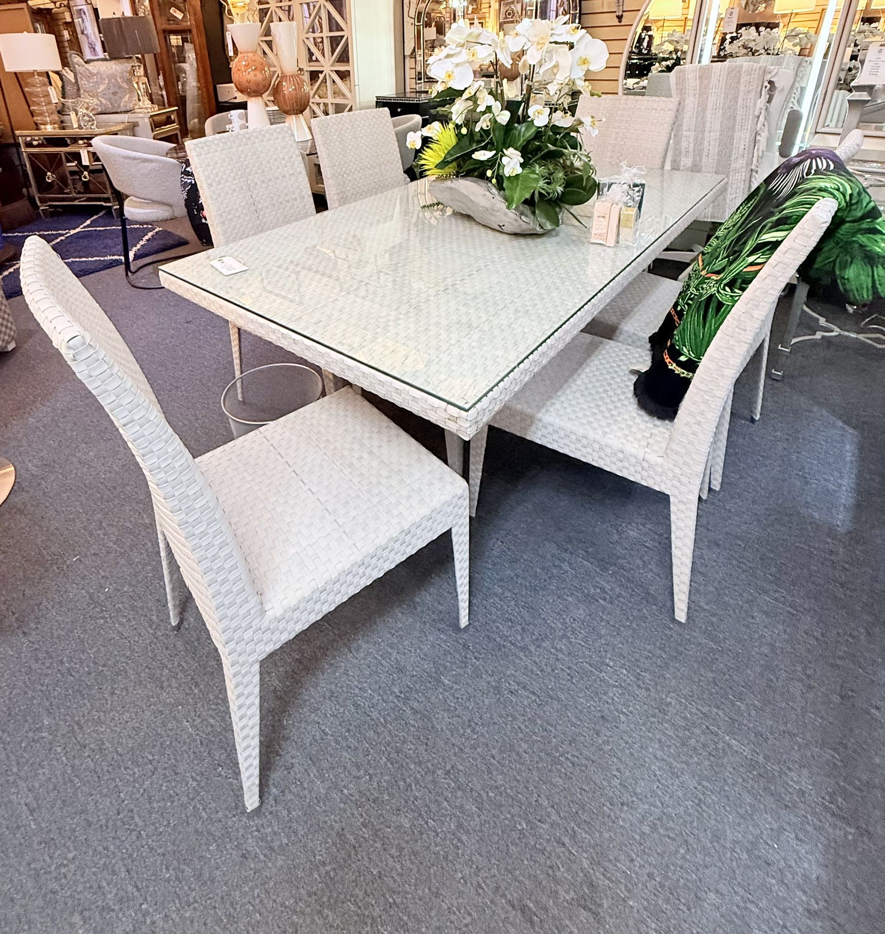 WE HAVE A LARGE INVENTORY IN HIGHEND FURNITURE, WOOD FURNITURE WITH ALL DIFFERENT COLLECTIONS. DINING ROOM SETS, BEDROOM SETS, LIVING ROOM SETS AND MANY OTHER BRANDS LIKE MAITLAND SMITH, VERSACE, BERNHARDT, HENREDON, BENNETTI AND ALSO ITEMS TO COMPLEMENT YOUR HOME DECOR, ACCESSORIES, PERFUM, JEWELRY, CHANDELIERS AND MORE. Available to see in person in Fort Lauderdale!!!! WAS BEFORE: $695 NOW: $556 Elegant White Rattan dining set, The protagonist is a coastal or modern tropical style set. The table is rectangular with a synthetic wicker base woven in white or cream and a transparent tempered glass surface. The matching chairs have high backrests and a fully woven ergonomic design. In excellent condition! We also have AICO By Michael Amini Collections… AICO Furniture designed by Michael Amini has been a TOP name brand since 1988 AICO, which stands for Amini Innovation Corp, features original furniture designs and is known for high quality and intricately designed home furnishing case goods and upholstery. They offer many collections that suit various tastes and styles. Ask for our FINANCE LAYAWAY program!!! 🦊 Additional we have Available FINANCING with Klarna, PayPal, ACIMA And more!!! Available at: Snooty Fox Consignments 840 E Oakland Park Blvd Oakland Park, FL 33334 754.206.20.77